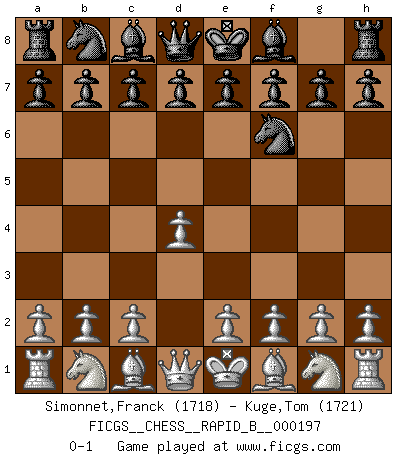 Last move : 0-1 2012 August 29 3:53:48 [Event "FICGS__CHESS__RAPID_B__000197"] [Site "FICGS"] [Date "2012.07.28"] [Round "1"] [White "Simonnet,Franck"] [Black "Kuge,Tom"] [Result "0-1"] [WhiteElo "1718"] [BlackElo "1721"] 1.d4 Nf6 0-1 This chess game has been lost on time (started : 2012.07.28 13:13:31) Queen's pawn game Player Black won this chess game. Follow this game move after move (download)Chess is a matter of delicate judgment, knowing when to punch and how to duck. (Bobby Fischer) Ein Gewinn durch eine ungenaue Kombination, sei sie auch noch so vorzeigbar, erfüllt mich mit Schaudern. (Wilhelm Steinitz) Evita las multitudes. Haz independientemente tu propio razonamiento. Trata de ser el jugador de Ajedrez, no la pieza de Ajedrez. (Ralph Charell) La vérité est comme le meilleur coup aux échecs : elle existe, mais il faut la chercher. (Arturo Perez-Reverte) You have to believe in yourself. (Sun Tzu)