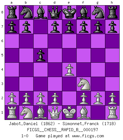 Last move : 1-0 2012 August 30 16:0:15 [Event "FICGS__CHESS__RAPID_B__000197"] [Site "FICGS"] [Date "2012.07.28"] [Round "1"] [White "Jabot,Daniel"] [Black "Simonnet,Franck"] [Result "1-0"] [WhiteElo "1862"] [BlackElo "1718"] 1.e4 c5 2.Nf3 1-0 This chess game has been lost on time (started : 2012.07.28 13:13:31) Sicilian defense Player White won this chess game. Follow this game move after move (download)When I asked Fischer why he had not played a certain move in our game, he replied: 'Well, you laughed when I wrote it down !' (Mikhail Tal) Im Leben werden Partien nie so unstrittig gewonnen wie im Spiel (Emanuel Lasker) No es tiempo de jugar al Ajedrez cuando la casa esta en llamas. (Proverbio Italiano) La menace est plus forte que l'exécution. (Aaron Nimzovitch) Macintosh - we might not get everything right, but at least we knew the century was going to end. (Douglas Adams)