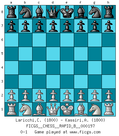 Last move : 0-1 2012 August 27 15:40:0 [Event "FICGS__CHESS__RAPID_B__000197"] [Site "FICGS"] [Date "2012.07.28"] [Round "1"] [White "Laricchi,Claudio"] [Black "Kassiri,Abdessamad"] [Result "0-1"] [WhiteElo "1800"] [BlackElo "1800"] 0-1 This chess game has been lost on time (started : 2012.07.28 13:13:31) Player Black won this chess game. Follow this game move after move (download)Live, lose, and learn, by observing your opponent how to win. (Amber Steenbock) Ich würde die 30 stärksten Spieler der USA im Simultanspiel besiegen. (José Raúl Capablanca) En posiciones complicadas, Bobby Fischer pocas veces tuvo que temer de cualquiera. (Paul Keres) Le joueur d'Echecs qui veut atteindre le top est obligé de développer son propre credo créatif. Alexeï Stepanovicth Souétine. Il est facile d'écrire des livres ! Ce qui est difficile, c'est de jouer ! (Alexeï Stepanovicth Souétine) The meaning of life is that it is to be lived, and it is not to be traded and conceptualized and squeezed into a pattern of systems. (Bruce Lee)