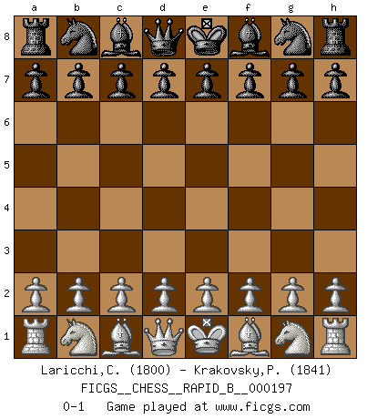 Last move : 0-1 2012 August 27 15:40:0 [Event "FICGS__CHESS__RAPID_B__000197"] [Site "FICGS"] [Date "2012.07.28"] [Round "1"] [White "Laricchi,Claudio"] [Black "Krakovsky,Peter"] [Result "0-1"] [WhiteElo "1800"] [BlackElo "1841"] 0-1 This chess game has been lost on time (started : 2012.07.28 13:13:31) Player Black won this chess game. Follow this game move after move (download)Not only will I predict his triumph over Botvinnik, but I'll go further and say that he'll probably be the greatest Chess player that ever lived. (John Collins) Es genügt nicht ein guter Spieler zu sein, man muß auch gut spielen. (Siegbert Tarrasch) El Ajedrez tiene tanto misterio como las mujeres. (Purdy) Même si vous avez un bon coup à faire, regardez toujours s'il n'y en a pas un qui lui soit préférable. (Pedro Damiano) A good teacher is like a candle - it consumes itself to light the way for others. (Author unknown)