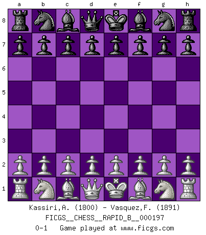 Last move : 0-1 2012 August 27 15:40:0 [Event "FICGS__CHESS__RAPID_B__000197"] [Site "FICGS"] [Date "2012.07.28"] [Round "1"] [White "Kassiri,Abdessamad"] [Black "Vasquez,Fernando"] [Result "0-1"] [WhiteElo "1800"] [BlackElo "1891"] 0-1 This chess game has been lost on time (started : 2012.07.28 13:13:31) Player Black won this chess game. Follow this game move after move (download)Chess mastery essentially consists of analyzing Chess positions accurately. (Mikhail Botvinnik) Ich war zu klein für die Schach-Schülermannschaft! (Woody Allen) Haz el enroque temprano y seguido. (Rob Sillars) Pour se monter efficace, un Cavalier a besoin d'avant-postes ! Les Cavaliers font les meilleurs bloqueurs de pions passés. It's not enough to succeed. Others must fail. (Gore Vidal)