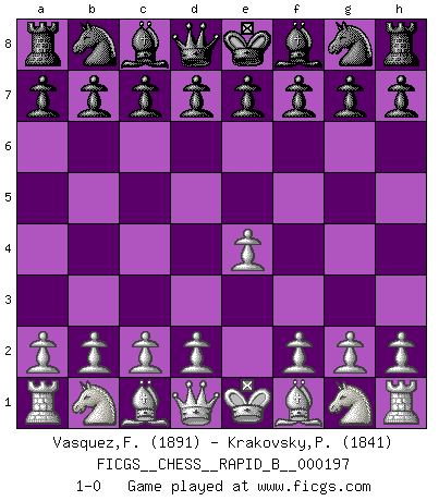 Last move : 1-0 2012 August 28 3:46:58 [Event "FICGS__CHESS__RAPID_B__000197"] [Site "FICGS"] [Date "2012.07.28"] [Round "1"] [White "Vasquez,Fernando"] [Black "Krakovsky,Peter"] [Result "1-0"] [WhiteElo "1891"] [BlackElo "1841"] 1.e4 1-0 This chess game has been lost on time (started : 2012.07.28 13:13:31) King's pawn Opening Player White won this chess game. Follow this game move after move (download)The game of Chess is not merely an idle amusement; several very valuable qualities of the mind are to be acquired and strengthened by it, so as to become habits ready on all occasions; for life is a kind of Chess. (Benjamin Franklin) Jeder Schachmeister war einmal ein Anfänger. (Irving Chernev) Una buena memoria, concentración, imaginación y una fuerte voluntad, se requiere para llegar a ser un buen jugador. (Bobby Fischer) Le système Elo représente seulement une moyenne. Il est simplement un indicateur de votre stabilité. (Anatoli Karpov) Secret operations are essential in war; upon them the army relies to make its every move. (Sun Tzu)