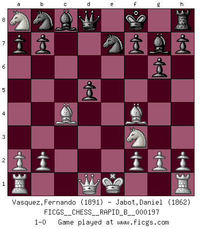 Last move : 1-0 2012 September 22 8:10:24 [Event "FICGS__CHESS__RAPID_B__000197"] [Site "FICGS"] [Date "2012.07.28"] [Round "1"] [White "Vasquez,Fernando"] [Black "Jabot,Daniel"] [Result "1-0"] [WhiteElo "1891"] [BlackElo "1862"] 1.e4 c5 2.d4 cxd4 3.c3 dxc3 4.Nxc3 g6 5.Nf3 Bg7 6.Bc4 e6 7.Nb5 d5 8.exd5 exd5 9.Bf4 Ne7 10.Nc7+ Kf8 11.Nxa8 1-0 Sicilian : Smith-Morra gambit Player White won this chess game. Follow this game move after move (download)Some part of a mistake is always correct. (Savielly Tartakover) Schach sollte überall auf der Welt Schulfach werden. Es fördert die geistige Auseinandersetzung. Es lehrt die Demut in der Niederlage. (Garry Kasparov) El Ajedrez es como la guerra en un tablero. (Bobby Fischer) Vouloir jouer aux échecs contre soi-même est aussi paradoxal que vouloir marcher sur son ombre. (Stefan Zweig) Empty your mind, be formless, shapeless — like water. (Bruce Lee)