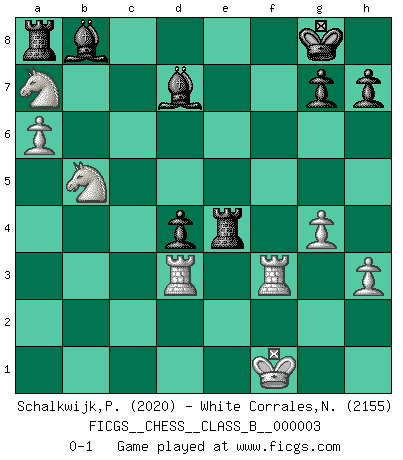 Last move : 0-1 2006 September 21 6:2:23 [Event "FICGS__CHESS__CLASS_B__000003"] [Site "FICGS"] [Date "2006.05.14"] [Round "1"] [White "Schalkwijk,Peter"] [Black "White Corrales,Nicolas"] [Result "0-1"] [WhiteElo "2020"] [BlackElo "2155"] 1.e4 e5 2.Nf3 Nc6 3.d4 exd4 4.c3 d5 5.Bd3 Nf6 6.e5 Ne4 7.cxd4 Bb4+ 8.Bd2 Nxd2 9.Nbxd2 Bg4 10.Bb5 O-O 11.Bxc6 bxc6 12.O-O c5 13.dxc5 Bxc5 14.Qa4 Qd7 15.Qxd7 Bxd7 16.Nb3 Bb6 17.Rfd1 c6 18.Rac1 Rae8 19.a4 f6 20.a5 Bc7 21.Nbd4 fxe5 22.Nxc6 e4 23.Nfd4 Bf4 24.Rc2 e3 25.Kf1 a6 26.h3 exf2 27.Rxf2 Re4 28.Rd3 Rfe8 29.g4 Be3 30.Rf3 Bc1 31.b4 Rc8 32.b5 axb5 33.Na7 Ra8 34.Ndxb5 d4 35.a6 Be3 36.Rb3 Bf4 37.Rbd3 Bb8 0-1 Scotch : Goering gambit Kingside Castling by player Black (move 10) Kingside Castling by player White (move 12) Player Black won this chess game. Follow this game move after move (download)I have never in my life played the French Defence, which is the dullest of all openings. (Wilhelm Steinitz) Spiel ein langweiliges Spiel zu Ende und lustige Dinge können passieren. (Hans Ree) Si yo gano un torneo, yo lo gano por mí mismo. Yo hago las jugadas. Nadie me ayuda. (Bobby Fischer) Les échecs, c'est l'imagination. (David Bronstein) Memory is a complicated thing, a relative to truth, but not its twin. (Barbara Kingsolver, Animal Dreams)