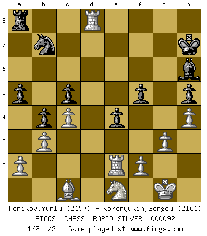 Last move : 1/2-1/2 2012 August 7 11:46:7 [Event "FICGS__CHESS__RAPID_SILVER__000092"] [Site "FICGS"] [Date "2012.07.28"] [Round "2"] [White "Perikov,Yuriy"] [Black "Kokoryukin,Sergey"] [Result "1/2-1/2"] [WhiteElo "2197"] [BlackElo "2161"] 1.d4 Nf6 2.c4 e6 3.Nf3 b6 4.g3 Ba6 5.Qa4 Be7 6.Bg2 Bb7 7.O-O c5 8.Nc3 O-O 9.dxc5 bxc5 10.Rd1 Qb6 11.Bf4 Rd8 12.Rd2 d6 13.Rad1 h6 14.Qb5 Ne8 15.e4 g5 16.Be3 Nd7 17.h4 g4 18.Ne1 Kg7 19.Qa4 Ne5 20.b3 Qb4 21.Qxb4 cxb4 22.Ne2 Nf6 23.Nf4 Nxe4 24.Rd4 Nc5 25.Bxb7 Nxb7 26.Nfd3 a5 27.Rd2 Nd7 28.Rxg4+ Kh7 29.Bd4 e5 30.Re4 Bf8 31.Bb2 f5 32.Re3 h5 33.Rd1 Bh6 34.Re2 e4 35.Bc1 Ndc5 36.Nxc5 dxc5 37.Rxd8 1/2-1/2 Queen's Indian : Nimzovich variation (exaggerated Fianchetto) Kingside Castling by player White (move 7) Kingside Castling by player Black (move 8) This chess game ended in a draw. Follow this game move after move (download)There's never before been a Chess player with such a thorough knowledge of the intricacies of the game and such an absolutely indomitable will to win. I think Bobby is the greatest player that ever lived. (Lisa Lane) Über Kasparov: Es ist offensichtlich, daß er in einem totalitären Staat aufwuchs und deshalb zu diktatorischen Zügen neigt. (Viktor Kortschnoi) Bobby solo arroja las piezas y solas caen en las casillas correctas. (Miguel Najdorf ) Il n'y a plus de joueurs du niveau de Jacob Murray dont la seule quête est le beau jeu, le plaisir de voir les pièces construire quelque chose. Sur 10 idées à la minute, 9 seront sans intérêt, la dernière s'avèrera géniale. (Christian Bauer) Hold em is to stud what chess is to checkers. (Johnny Moss)