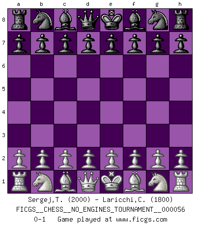 Last move : 0-1 2012 September 7 5:27:54 [Event "FICGS__CHESS__NO_ENGINES_TOURNAMENT__000056"] [Site "FICGS"] [Date "2012.07.28"] [Round "1"] [White "Sergej,Thigorin"] [Black "Laricchi,Claudio"] [Result "0-1"] [WhiteElo "2000"] [BlackElo "1800"] 0-1 This chess game has been lost on time (started : 2012.07.28 20:13:3) Player Black won this chess game. Follow this game move after move (download)Robert Fischer is a law unto himself. (Larry Evans) Ich suche im Schach immer etwas Eigenes. Riskantes Spiel im Stile schachlicher Musketiere ist nicht meine Sache, auch wenn es vielen Freunden scharfer Wendungen gefällt. (Anatoly Karpov) Buenas posiciones no logran ganar juegos, buenas movidas sí. (Gerald Abrahams) La victoire dans une partie d'Echecs appartient la plupart du temps à celui qui voit un peu plus loin que l'adversaire. (Lasker) Luck has a peculiar habit of favoring those who don't depend on it. (Author unknown)