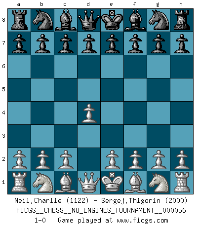 Last move : 1-0 2012 September 7 5:27:54 [Event "FICGS__CHESS__NO_ENGINES_TOURNAMENT__000056"] [Site "FICGS"] [Date "2012.07.28"] [Round "1"] [White "Neil,Charlie"] [Black "Sergej,Thigorin"] [Result "1-0"] [WhiteElo "1122"] [BlackElo "2000"] 1.d4 1-0 This chess game has been lost on time (started : 2012.07.28 20:13:3) Queen's pawn Player White won this chess game. Follow this game move after move (download)Chess is a terrible game. If you have no center, your opponent has a freer position. If you do have a center, then you really have something to worry about ! (Siegbert Tarrasch) Wie kann ich Remis annehmen? Ich weiß ja gar nicht, wie ich stehe! (Fritz Sämisch) Sin errores no puede haber brillantez. (Emanuel Lasker) Le jeu d'échecs est comme rejeté hors du temps. (Antoine de Saint-Exupéry) Happy endings are just stories that haven't finished yet. (Jane Smith in Mr & Mrs Smith)