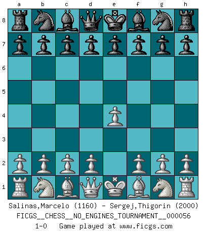 Last move : 1-0 2012 September 7 5:27:54 [Event "FICGS__CHESS__NO_ENGINES_TOURNAMENT__000056"] [Site "FICGS"] [Date "2012.07.28"] [Round "1"] [White "Salinas,Marcelo"] [Black "Sergej,Thigorin"] [Result "1-0"] [WhiteElo "1160"] [BlackElo "2000"] 1.e4 1-0 This chess game has been lost on time (started : 2012.07.28 20:13:3) King's pawn Opening Player White won this chess game. Follow this game move after move (download)You cannot play at Chess if you are kind-hearted. (French Proverb) Ein Springer auf f6 gegen die eigene Rochadestellung ist schlimmer als ein rostiger Nagel im Knie. (Efim Bogoljubov) Si no le temes a Spassky, entonces elimino el elemento del dinero. (Jim Slater) Echiquier : carré parfait, comme la Jérusalem nouvelle décrite par l'auteur de l'Apocalypse, huit cases sur huit, exaltation du chiffre 4, symbole du cosmos aux quatre horizons... où le noir et le blanc, l'ombre et la lumière, le mal et le bien s'entremêlent et se conjuguent. (Robert Couffignal, Le Gambit du poète) CHESS, n. f. [echecs, Fr.] A nice and abstruse game, in which two sets of puppets are moved in opposition to each other. (Dr Samuel Johnson, A Dictionary Of The English Language, 1755)