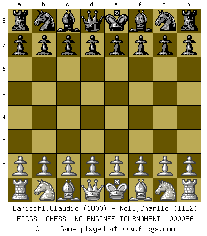 Last move : 0-1 2012 September 7 5:27:54 [Event "FICGS__CHESS__NO_ENGINES_TOURNAMENT__000056"] [Site "FICGS"] [Date "2012.07.28"] [Round "1"] [White "Laricchi,Claudio"] [Black "Neil,Charlie"] [Result "0-1"] [WhiteElo "1800"] [BlackElo "1122"] 0-1 This chess game has been lost on time (started : 2012.07.28 20:13:3) Player Black won this chess game. Follow this game move after move (download)Chess is a part of culture and if a culture is declining then Chess too will decline. (Mikhail Botvinnik) Wir irren allesamt, nur jeder irrt anders. (Georg Christoph Lichtenberg) Prefiero perder una partida realmente buena, que ganar una mala. (David Levy) La guerre est enfant de la passion, la passion est enfant du narcissisme et le narcissisme est l'enfant. (...) Une autre partie ? (Thibault de Vassal) The large trees attract high winds. (Chinese proverb)