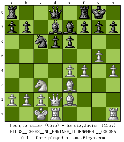 Last move : 0-1 2012 November 22 22:54:29 [Event "FICGS__CHESS__NO_ENGINES_TOURNAMENT__000056"] [Site "FICGS"] [Date "2012.07.28"] [Round "1"] [White "Pech,Jaroslav"] [Black "Garcia,Javier"] [Result "0-1"] [WhiteElo "0675"] [BlackElo "1557"] 1.e4 c5 2.Nf3 d6 3.d4 cxd4 4.Nxd4 Nf6 5.Nc3 e6 6.g4 Be7 7.g5 Nfd7 8.h4 O-O 9.Be3 Nc6 10.Qd2 Nxd4 11.Qxd4 Ne5 12.Be2 Nc6 13.Qd2 Ne5 14.O-O-O Bd7 15.f4 Nc6 0-1 This chess game has been lost on time (started : 2012.07.28 20:13:3) Sicilian : Scheveningen, Keres attack Kingside Castling by player Black (move 8) Queenside Castling by player White (move 14) Player Black won this chess game. Follow this game move after move (download)I'm not a materialistic person, in that, I don't suffer the lack or loss of money. The absence of worldly goods I don't look back on. For Chess is a way I can be as materialistic as I want without having to sell my soul. (Jamie Walter Adams) Es hat in meinem Leben Zeiten gegeben, da ich sehr nahe daran war zu glauben, daß ich auch nicht eine einzige Schachpartie verlieren könnte. (José Raúl Capablanca) Yo adoro todas la posiciones. Denme una partida posicional difícil, y la jugaré. Pero posiciones totalmente ganadas, no las tolero. (Hein Donner) Le temps de noter son nom sur la feuille de partie, j'étais déjà en zeitnot ! D'un modeste amateur apparié lors de la première ronde d'un open contre le grand-maître Azmaïparashvili. There are 10 types of people in this world: those who understand binary and those who don't. (Anonymous)