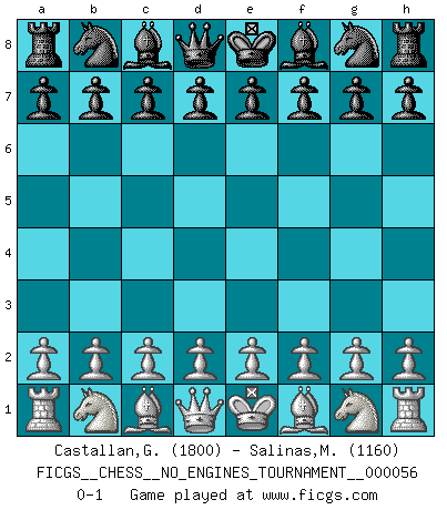 Last move : 0-1 2012 September 7 5:27:54 [Event "FICGS__CHESS__NO_ENGINES_TOURNAMENT__000056"] [Site "FICGS"] [Date "2012.07.28"] [Round "1"] [White "Castallan,Gerald"] [Black "Salinas,Marcelo"] [Result "0-1"] [WhiteElo "1800"] [BlackElo "1160"] 0-1 This chess game has been lost on time (started : 2012.07.28 20:13:3) Player Black won this chess game. Follow this game move after move (download)The laws of Chess do not permit a free choice: you have to move whether you like it or not. (Emanuel Lasker) Jede Eröffnung ist gut genug um gespielt zu werden, wenn nur ihr Ruf schlecht genug ist. (Savielly Grigorievitsch Tartakower) Yo he agregado estos principios a la ley: pongan los Caballos en acción antes de que los dos Alfiles sean desarrollados. (Emanuel Lasker) Ce n'est pas pour s'amuser qu'il joue aux échecs : il célèbre un culte. (Vladimir Nabokov) Games, world of games... There's always an opponent, and there's always a victim. (Revolver, movie)