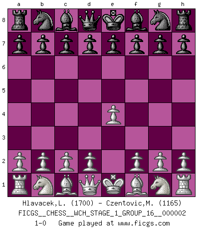 Last move : 1-0 2007 February 16 10:32:43 [Event "FICGS__CHESS__WCH_STAGE_1_GROUP_16__000002"] [Site "FICGS"] [Date "2007.01.16"] [Round "1"] [White "Hlavacek,Ladislav"] [Black "Czentovic,Mirko"] [Result "1-0"] [WhiteElo "1700"] [BlackElo "1165"] 1.e4 1-0 This chess game has been lost on time (started : 2007.01.16 15:27:10) King's pawn Opening Player White won this chess game. Follow this game move after move (download)Let the perfectionist play postal. (Yasser Seirawan) Man wirke der falschen Auffassung entgegen, als ob jeder Zug Unmittelbares zu leisten habe; auch Werte- und Ruhezüge haben ihre Existenzberechtigung. (Aaron Nimzowitsch) El jugador táctico debe saber que hacer cuando algo se debe de hacer. El estratégico debe saber que hacer cuando nada se debe de hacer. (Savielly Tartakover) Roi des jeux et jeu des rois, les échecs portent en eux un sentiment d'infini. Ils donnent à celui qui s'est efforcé d'en approfondir les arcanes l'impression de n'être pas à la mesure de l'homme; en fait, ils constituent un résumé de l'univers, un microcosme, et figurent cette grande échelle qui, dans les plans de la lumière descend jusqu'à la matière, qui des abîmes insondables remonte jusqu'en l'infini de Dieu. (Pyrame) I've never seen so many men wasted so badly. (Blondie in The Good, The Bad and The Ugly)