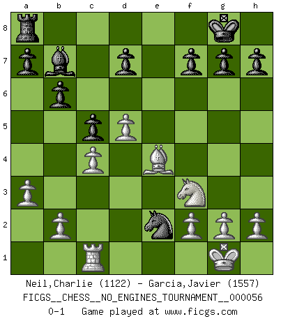 Last move : 0-1 2012 August 26 23:44:29 [Event "FICGS__CHESS__NO_ENGINES_TOURNAMENT__000056"] [Site "FICGS"] [Date "2012.07.28"] [Round "1"] [White "Neil,Charlie"] [Black "Garcia,Javier"] [Result "0-1"] [WhiteElo "1122"] [BlackElo "1557"] 1.d4 Nf6 2.c4 e6 3.Nf3 Bb4+ 4.Bd2 Bxd2+ 5.Nbxd2 b6 6.e3 Bb7 7.Bd3 O-O 8.O-O Nc6 9.Rc1 Re8 10.a3 Ne7 11.Re1 Ng6 12.e4 c5 13.d5 exd5 14.exd5 Rxe1+ 15.Qxe1 Nf4 16.Bb1 Qe8 17.Ne4 Nxe4 18.Qxe4 Qxe4 19.Bxe4 Ne2+ 0-1 Bogo-Indian defense Kingside Castling by player Black (move 7) Kingside Castling by player White (move 8) Player Black won this chess game. Follow this game move after move (download)I know people who have all the will in the world, but still can't play good Chess. (Bobby Fischer) Aljechin war kein Nazi. Er war ein Opportunist. Ein schrecklicher Mann. Er liebte Geld über alles und würde für Geld ein Jude, ein Katolik oder ein Protestant werden. (Miguel Najdorf) Cuando veas una buena jugada, trata de encontrar otra mejor. (Emanuel Lasker) Vous savez, camarade Pachman, je n'éprouve pas de plaisir à être ministre, je jouerais plutôt aux échecs comme vous, ou alors ferais une révolution au Venezuela. (Che Guevara à Ludek Pachman, 'Checkmate in Prague', 1975) To send light into the darkness of men's hearts - such is the duty of the artist. (Schumann)