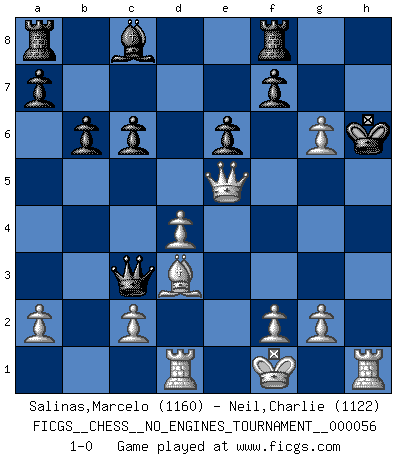 Last move : 1-0 2012 October 27 22:40:19 [Event "FICGS__CHESS__NO_ENGINES_TOURNAMENT__000056"] [Site "FICGS"] [Date "2012.07.28"] [Round "1"] [White "Salinas,Marcelo"] [Black "Neil,Charlie"] [Result "1-0"] [WhiteElo "1160"] [BlackElo "1122"] 1.d4 d5 2.Nf3 Nf6 3.Qd3 c6 4.Ng5 e6 5.Nd2 Bd6 6.Ndf3 Qc7 7.e4 Nxe4 8.Nxe4 dxe4 9.Qxe4 Nd7 10.Ng5 Nf6 11.Qf3 O-O 12.Bd3 h6 13.Ne4 Be7 14.Nxf6+ Bxf6 15.Bf4 Qb6 16.Qe4 g6 17.Bxh6 Bg7 18.Bxg7 Kxg7 19.h4 Qxb2 20.Qe5+ Kh7 21.Rd1 Qc3+ 22.Kf1 b6 23.h5 Kh6 24.hxg6 1-0 Queen's pawn game Kingside Castling by player Black (move 11) Player White won this chess game. Follow this game move after move (download)The isolated Pawn casts gloom over the entire chessboard. (Aaron Nimzovich) Ich hatte Angst gegen einen russischen Großmeister zu verlieren, und er befürchtete gegen einen kleinen Jungen zu verlieren. (über ein Remis gegen Juri Awerbach). (Robert James Fischer) El Ajedrez es despiadado: debes de estar preparado para matar gente. (Nigel Short) Si le désir cupide (et stupide) de gagner est une inépuisable source de souffrance, une combinaison brillante sur l'échiquier est une découverte : le coquelicot qui s'épanouit lorsque apparaît la Voie Lactée. (Arrabal) There is a very easy way to return from a casino with a small fortune : go there with a large one. (Jack Yelton)