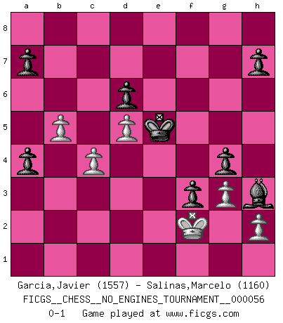 Last move : 0-1 2013 January 2 19:59:45 [Event "FICGS__CHESS__NO_ENGINES_TOURNAMENT__000056"] [Site "FICGS"] [Date "2012.07.28"] [Round "1"] [White "Garcia,Javier"] [Black "Salinas,Marcelo"] [Result "0-1"] [WhiteElo "1557"] [BlackElo "1160"] 1.e4 e5 2.Nf3 Qf6 3.Nc3 Bc5 4.Nd5 Qd6 5.Bc4 Nc6 6.c3 Nge7 7.Nxc7+ Qxc7 8.O-O d6 9.Qb3 O-O 10.Ng5 Ng6 11.Bxf7+ Rxf7 12.Qxf7+ Qxf7 13.Nxf7 Kxf7 14.d3 Nf4 15.Bxf4 exf4 16.d4 Bb6 17.d5 Ne5 18.g3 f3 19.Rad1 Bh3 20.Rfe1 Ng4 21.Rd2 Ne5 22.b3 Rc8 23.Rc2 g5 24.c4 Nd3 25.Rd1 Bxf2+ 26.Rxf2 Nxf2 27.Kxf2 g4 28.a4 Re8 29.Re1 Kf6 30.b4 b6 31.a5 bxa5 32.b5 a4 33.e5+ Rxe5 34.Rxe5 Kxe5 0-1 Greco defense Kingside Castling by player White (move 8) Kingside Castling by player Black (move 9) Player Black won this chess game. Follow this game move after move (download)The passed pawn is a criminal, who should be kept under lock and key. Mild measures, such as police surveillance, are not sufficient. (Nimzovitch) Ich habe kein Problem mit Frauen, sondern nur mit dem Niveau ihres Schachspiels (Judith Polgar) El Ajedrez es de 30 a 40 por ciento psicología. Uno no cuenta con esto cuando se juega contra una computadora. No lo puedo confundir. (Judith Polgar) La victoire dans une partie d'Echecs appartient la plupart du temps à celui qui voit un peu plus loin que l'adversaire. (Lasker) I feel so... helpless. (C-3PO in Star Wars ep.3)