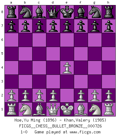Last move : 1-0 2012 July 29 12:4:13 [Event "FICGS__CHESS__BULLET_BRONZE__000726"] [Site "FICGS"] [Date "2012.07.29"] [Round "1"] [White "Hoe,Yu Ming"] [Black "Khan,Valery"] [Result "1-0"] [WhiteElo "1896"] [BlackElo "1985"] 1.e4 1-0 This chess game has been lost on time (started : 2012.07.29 10:18:45) King's pawn Opening Player White won this chess game. Follow this game move after move (download)Adequate compensation for a sacrifice is having a sound combination leading to a winning position; adequate compensation for a blunder is having your opponent snatch defeat from the jaws of victory. (Bruce A. Moon) Schach ist gnadenlos. Du mußt bereit sein zu töten. (Nigel Short) Después de la respuesta de las negras a 1.e4 con 1..e5, se quedan siempre tratando de entrar dentro del juego. (Howard Staunton) Le jeu d'échecs est comme rejeté hors du temps. (Antoine de Saint-Exupéry) Now the reason the enlightened prince and the wise general conquer the enemy whenever they move and their achievements surpass those of ordinary men is foreknowledge. (Sun Tzu)