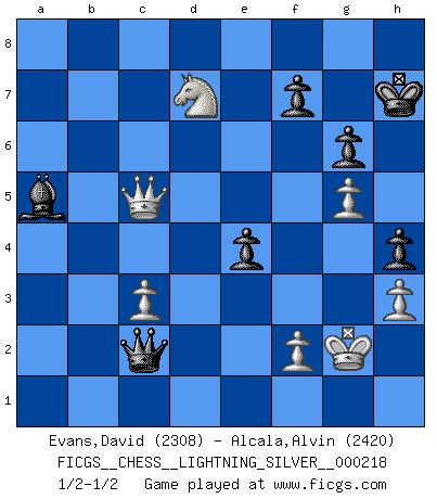 Last move : 1/2-1/2 2012 July 29 21:33:26 [Event "FICGS__CHESS__LIGHTNING_SILVER__000218"] [Site "FICGS"] [Date "2012.07.29"] [Round "1"] [White "Evans,David"] [Black "Alcala,Alvin"] [Result "1/2-1/2"] [WhiteElo "2308"] [BlackElo "2420"] 1.e4 c5 2.Nf3 d6 3.d4 cxd4 4.Nxd4 Nf6 5.Nc3 a6 6.h3 e5 7.Nde2 h5 8.g3 Nbd7 9.a4 Be7 10.a5 Nc5 11.Bg2 b5 12.axb6 Qxb6 13.O-O O-O 14.Bg5 Be6 15.Qd2 a5 16.Rfb1 Rfc8 17.Bxf6 Bxf6 18.Nd5 Bxd5 19.Qxd5 Nb7 20.Nc3 h4 21.g4 Nd8 22.Qd1 Qc6 23.Nd5 Ne6 24.c3 a4 25.Bf1 Bd8 26.Ra2 Nc5 27.Qf3 Qb7 28.Bc4 Ne6 29.Qe2 Rcb8 30.Rba1 Ra5 31.Qc2 Nc5 32.Qb1 Rba8 33.Qd1 Nxe4 34.Qf3 Nc5 35.g5 e4 36.Qf4 g6 37.b4 axb3 38.Rxa5 Rxa5 39.Rxa5 b2 40.Ba2 b1Q+ 41.Bxb1 Qxb1+ 42.Kh2 Bxa5 43.Nf6+ Kf8 44.Qxd6+ Kg7 45.Qxc5 Qc2 46.Nd7 Kh7 47.Kg2 1/2-1/2 Sicilian : Najdorf, Adams attack Kingside Castling by player White (move 13) Kingside Castling by player Black (move 13) Promotion Queen by player Black (move 40) This chess game ended in a draw. Follow this game move after move (download)Of all my Russian books, the defense contains and diffuses the greatest 'warmth' which may seem odd seeing how supremely abstract Chess is supposed to be. (Vladimir Nabokov) Schon mancher Spieler hat aufgegeben, um zu vermeiden, daß er eine Figur verliert. (Savielly Grigorievitsch Tartakower) El Ajedrez se juega con la mente... ¡no con las manos!. (Renaud y Kahn) On peut tirer plus d'utilité d'une partie perdue que de 100 parties gagnées. (Capablanca) I have opinions of my own - strong opinions - but I don't always agree with them. (George Bush)