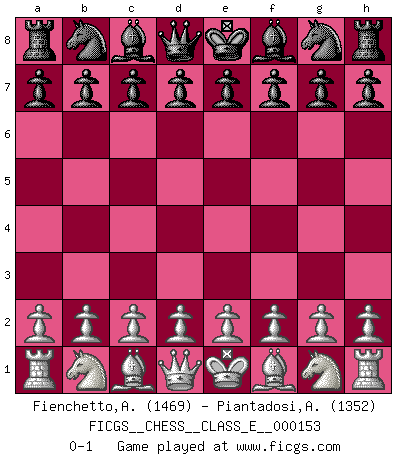 Last move : 0-1 2012 September 8 17:37:46 [Event "FICGS__CHESS__CLASS_E__000153"] [Site "FICGS"] [Date "2012.07.30"] [Round "1"] [White "Fienchetto,Andy"] [Black "Piantadosi,Angelo"] [Result "0-1"] [WhiteElo "1469"] [BlackElo "1352"] 0-1 This chess game has been lost on time (started : 2012.07.30 10:33:35) Player Black won this chess game. Follow this game move after move (download)Castle early and often. (Rob Sillars) Ich bewundere Kasparows phantasievolle Angriffssiege aus den Achtzigern und Neunzigern, aber wenn man sie mit dem Computer überprüft, nimmt der Computer in jeder zweiten Partie die Opfer an, verteidigt sich und gewinnt. (Vladimir Kramnik) Las ideas audaces son como las piezas del Ajedrez que avanzan hacia adelante. Ellas pueden ser vencidas, pero también pueden iniciar una partida victoriosa. (Goethe) Il a essayé de se convaincre qu'il pourrait empêcher toutes les erreurs et ne jamais perdre. L'horreur ! Gary Kasparov au sujet de Robert Fischer. Wikichess, chess moves explained by 'experimented' players. (Thibault de Vassal)