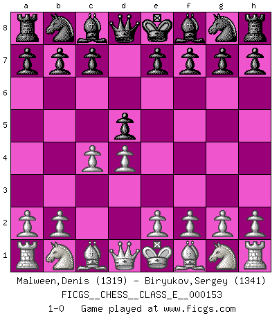 Last move : 1-0 2012 September 13 18:29:33 [Event "FICGS__CHESS__CLASS_E__000153"] [Site "FICGS"] [Date "2012.07.30"] [Round "1"] [White "Malween,Denis"] [Black "Biryukov,Sergey"] [Result "1-0"] [WhiteElo "1319"] [BlackElo "1341"] 1.d4 d5 2.c4 1-0 This chess game has been lost on time (started : 2012.07.30 10:33:35) Queen's Gambit Player White won this chess game. Follow this game move after move (download)Chess is everything: art, science and sport. (Anatoly Karpov) Ich war schon mal beim Dopingtest. Da musste ich Urin abgeben, während Dritte zusahen. (Elisabeth Pähtz) El Ajedrez es una guerra en un tablero. El objetivo es aplastar la mente del oponente. (Bobby Fischer) Les échecs, c'est l'imagination. (David Bronstein) Treat your password like your toothbrush. Don't let anybody else use it, and get a new one every six months. (Clifford Stoll)