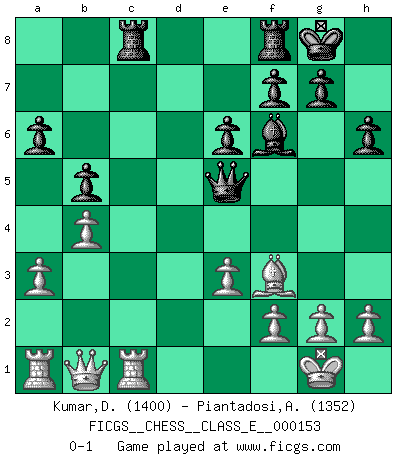Last move : 0-1 2013 January 10 0:2:49 [Event "FICGS__CHESS__CLASS_E__000153"] [Site "FICGS"] [Date "2012.07.30"] [Round "1"] [White "Kumar,Dhirendra"] [Black "Piantadosi,Angelo"] [Result "0-1"] [WhiteElo "1400"] [BlackElo "1352"] 1.d4 d5 2.c4 e6 3.Nc3 Nf6 4.Nf3 Be7 5.Bg5 O-O 6.Bxf6 Bxf6 7.e3 dxc4 8.Bxc4 c5 9.Ne4 Be7 10.O-O cxd4 11.Nxd4 a6 12.a3 b5 13.Bd3 Bb7 14.b4 Nc6 15.Nxc6 Bxc6 16.Qc2 Rc8 17.Qb1 h6 18.Rd1 Bxe4 19.Bxe4 Qc7 20.Rc1 Qe5 21.Bf3 Bf6 0-1 This chess game has been lost on time (started : 2012.07.30 10:33:35) QGD : 4.Nf3 Kingside Castling by player Black (move 5) Kingside Castling by player White (move 10) Player Black won this chess game. Follow this game move after move (download)Good positions don't win games, good moves do. (Gerald Abrahams) Schach ist mein Leben, meine Leidenschaft, was ich gelernt habe und seit meinem 14. Lebensjahr profimässig praktiziere. Darauf zu verzichten, würde mir sehr schwer fallen. (Viktor Kortschnoi) El Ajedrez es la vida. (Bobby Fischer) Je crois qu'il existe des manières très spécifiques de jouer efficacement contre une machine. Evidemment, nous n'avons aucune chance en technique pure, parce que l'ordinateur calcule de manière parfaite. Mais lorsque nous faisons appel à notre cerveau, en utilisant l'intuition et la compréhension, alors nous restons beaucoup plus forts. (Anatoli Karpov) For peace of mind, resign as general manager of the universe. (Douglas Adams)