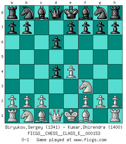 Last move : 0-1 2012 September 11 18:20:1 [Event "FICGS__CHESS__CLASS_E__000153"] [Site "FICGS"] [Date "2012.07.30"] [Round "1"] [White "Biryukov,Sergey"] [Black "Kumar,Dhirendra"] [Result "0-1"] [WhiteElo "1341"] [BlackElo "1400"] 1.e4 c5 2.Nf3 d6 3.d4 cxd4 0-1 This chess game has been lost on time (started : 2012.07.30 10:33:35) Sicilian Player Black won this chess game. Follow this game move after move (download)When you absolutely don't know what to do anymore, it is time to panic. (John van der Wiel) Wer wird heute Abend ihr Gegner sein? -- Heute Abend spiele ich gegen die schwarzen Steine. (Akiba Rubinstein) a manera como él juega al Ajedrez, demuestra la completa naturaleza de un hombre. (Stanley Ellin) Si le désir cupide (et stupide) de gagner est une inépuisable source de souffrance, une combinaison brillante sur l'échiquier est une découverte : le coquelicot qui s'épanouit lorsque apparaît la Voie Lactée. (Arrabal) Lottery : A tax on people who are bad at math. (Author unknown)