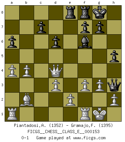 Last move : 0-1 2012 September 20 0:19:3 [Event "FICGS__CHESS__CLASS_E__000153"] [Site "FICGS"] [Date "2012.07.30"] [Round "1"] [White "Piantadosi,Angelo"] [Black "Gramajo,Francisco"] [Result "0-1"] [WhiteElo "1352"] [BlackElo "1395"] 1.c4 Nc6 2.Nc3 b6 3.g3 Bb7 4.Bg2 e5 5.Nf3 Be7 6.O-O Nf6 7.d3 Nd4 8.Nxe5 Bxg2 9.Kxg2 d6 10.Nf3 Nxf3 11.Kxf3 Qd7 12.Kg2 Qc6+ 13.Kg1 O-O 14.b4 a6 15.a4 b5 16.Qb3 bxc4 17.Qxc4 Qd7 18.Bb2 Qh3 19.f3 h5 20.Ne4 Nxe4 21.Qxe4 Rae8 22.Qd4 Bf6 0-1 English Opening Kingside Castling by player White (move 6) Kingside Castling by player Black (move 13) Player Black won this chess game. Follow this game move after move (download)You are for me the Queen on d8 and I am the Pawn on d7 !! (Eduard Gufeld) Ein Großmeister muß tausende Partien in seinem Kopf speichern, denn diese sind für Ihn, was die Worte der Muttersprache für gewöhnliche Leute sind, oder Noten für Musiker... (Garry Kasparov) El Ajedrez es un expediente tonto que hace creer a la gente inactiva que hacen una cosa muy astuta cuando solamente estan perdiendo su tiempo. (George Bernard Shaw) Shah mat. Le roi est mort. Cri de fierté d'un joueur venant de terrasser son adversaire, courtoisement, sans effusion de sang. Real knowledge is to know the extent of one's ignorance. (Confucius)