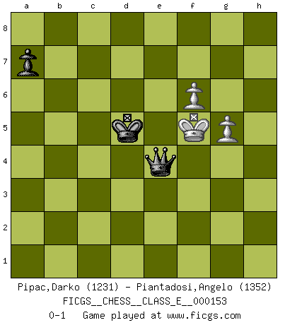 Last move : 0-1 2012 November 21 9:12:8 [Event "FICGS__CHESS__CLASS_E__000153"] [Site "FICGS"] [Date "2012.07.30"] [Round "1"] [White "Pipac,Darko"] [Black "Piantadosi,Angelo"] [Result "0-1"] [WhiteElo "1231"] [BlackElo "1352"] 1.e4 e6 2.d4 d5 3.exd5 exd5 4.Nf3 Nf6 5.h3 h6 6.a3 Bf5 7.Nc3 c6 8.Bd3 Bxd3 9.Qxd3 Bd6 10.O-O O-O 11.Re1 Nbd7 12.Be3 Re8 13.Ne2 Nh5 14.c3 Qc7 15.b4 Nf4 16.Nxf4 Bxf4 17.Bxf4 Qxf4 18.a4 Nf6 19.a5 Kf8 20.Qd2 Qxd2 21.Nxd2 Rxe1+ 22.Rxe1 Re8 23.Kf1 Rxe1+ 24.Kxe1 Ke7 25.Ke2 Ke6 26.Kf3 Kf5 27.g3 g5 28.c4 Ke6 29.g4 dxc4 30.Nxc4 Nd5 31.Ke4 Nxb4 32.f3 Nd5 33.Ne5 Nf4 34.Nd3 Nxd3 35.Kxd3 f5 36.Kc4 fxg4 37.hxg4 b6 38.a6 Kd6 39.Kd3 Kd5 40.Kc3 c5 41.dxc5 Kxc5 42.Kd3 Kb5 43.Ke4 Kxa6 44.Kf5 b5 45.Kg6 b4 46.Kxh6 b3 47.Kxg5 b2 48.f4 b1Q 49.f5 Qb5 50.Kh6 Qe5 51.Kg6 Qe8+ 52.Kg5 Kb6 53.f6 Kc6 54.Kf5 Kd5 55.g5 Qe4+ 0-1 French : Exchange variation Kingside Castling by player White (move 10) Kingside Castling by player Black (move 10) 10 pieces endgame at move 41 : White KPPPP , Black KPPPP WHITE : King + 4 Pawns BLACK : King + 4 Pawns 9 pieces endgame at move 41 : White KPPP , Black KPPPP WHITE : King + 3 Pawns BLACK : King + 4 Pawns 8 pieces endgame at move 43 : White KPP , Black KPPPP WHITE : King + 2 Pawns BLACK : King + 4 Pawns 7 pieces endgame at move 46 : White KPP , Black KPPP WHITE : King + 2 Pawns BLACK : King + 3 Pawns 6 pieces endgame at move 47 : White KPP , Black KPP WHITE : King + 2 Pawns BLACK : King + 2 Pawns Promotion Queen by player Black (move 48) Player Black won this chess game. Follow this game move after move (download)I'd rather have a Pawn than a finger. (Reuben Fine) Man kann eine Schachpartie nur gewinnen, wenn das Gleichgewicht gestört ist. In einer Stellung mit ungestörtem Gleichgewicht ist auch das größte Genie hilflos - in der Stellung steckt dann eben kein genialer Einfall. (Wilhelm Steinitz) La batalla por la última verdad nunca sera ganada. Y es por eso que el Ajedrez es tan fascinante. (Hans Kmoch) Tous ces prétendus hommes politiques sont les pions, les Cavaliers, les Tours ou les Fous d'une partie d'échecs qui se jouera tant qu'un hasard ne renversera pas l'échiquier. (Honoré de Balzac) He who is a good ruler must first have been ruled. (Aristotle)