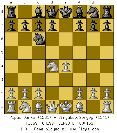 Last move : 1-0 2012 September 9 17:52:48 [Event "FICGS__CHESS__CLASS_E__000153"] [Site "FICGS"] [Date "2012.07.30"] [Round "1"] [White "Pipac,Darko"] [Black "Biryukov,Sergey"] [Result "1-0"] [WhiteElo "1231"] [BlackElo "1341"] 1.e4 e5 2.d4 exd4 3.Nf3 Nc6 4.Nxd4 1-0 This chess game has been lost on time (started : 2012.07.30 10:33:35) Centre game Player White won this chess game. Follow this game move after move (download)There must have been a time when men were demigods, or they could not have invented Chess. (Gustav Schenk) Das typische an einem Großmeister ist, daß er eine gewonnene Position schnell und schmerzlos gewinnt. (Irving Chernev) Antes de los Finales, los dioses han colocado el Juego Medio. (Siegbert Tarrasch) Vous m'avez demandé de vous exposer quel est le fondement de la prière. Je ne fais que préparer les pièces du jeu sur la table... Nous sera-t-il permis d'en adopter les règles et si nous les appliquons scrupuleusement nous ne tarderons pas à faire mat le Roi divin ! Il ne pourra échapper à nos mains. (Sainte Thérèse d'Avila, Chemin de perfection) If passion drives you, let reason holds the reins. (Benjamin Franklin)
