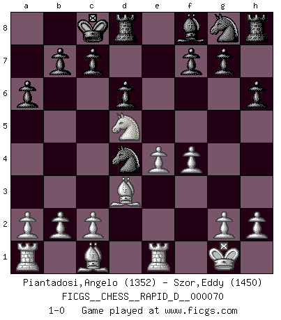 Last move : 1-0 2012 October 6 21:28:56 [Event "FICGS__CHESS__RAPID_D__000070"] [Site "FICGS"] [Date "2012.07.30"] [Round "1"] [White "Piantadosi,Angelo"] [Black "Szor,Eddy"] [Result "1-0"] [WhiteElo "1352"] [BlackElo "1450"] 1.e4 e5 2.Nf3 d6 3.d4 Nc6 4.dxe5 Bg4 5.Be2 Bxf3 6.Bxf3 Nxe5 7.Be2 a6 8.O-O h6 9.f4 Nc6 10.Nc3 Qh4 11.Qe1 Qxe1 12.Rxe1 Nd4 13.Bd3 O-O-O 14.Nd5 1-0 This chess game has been lost on time (started : 2012.07.30 10:34:17) Philidor's defense Kingside Castling by player White (move 8) Queenside Castling by player Black (move 13) Player White won this chess game. Follow this game move after move (download)Some part of a mistake is always correct. (Savielly Tartakover) Schach ist Krieg, im Schach geht es um testosterongesteuerte Urschreie. (Garry Kasparov) La vida es como un juego de Ajedrez, cambiando con cada movimiento. (Proverbio Chino) Un journaliste : 'Vous préférez avoir une dame de plus sur l'échiquier ou au lit ?' Boris Spassky : 'Ca dépend de la position.' If we don't succeed, we run the risk of failure. (George W. Bush)