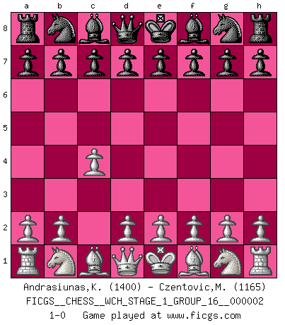 Last move : 1-0 2007 February 15 22:29:16 [Event "FICGS__CHESS__WCH_STAGE_1_GROUP_16__000002"] [Site "FICGS"] [Date "2007.01.16"] [Round "1"] [White "Andrasiunas,Kestutis"] [Black "Czentovic,Mirko"] [Result "1-0"] [WhiteElo "1400"] [BlackElo "1165"] 1.c4 1-0 This chess game has been lost on time (started : 2007.01.16 15:27:10) English Opening Player White won this chess game. Follow this game move after move (download)It's just you and your opponent at the board and you're trying to prove something. (Bobby Fischer) Darum geht es im Schach. Einen Tag gibst du deinem Gegner eine Lektion, am nächsten Tag gibt er dir eine. (Robert James Fischer) Un Peón pasado es un criminal, quién debe ser mantenido bajo candado y llave. Leves medidas, tales como vigilancia policiaca, no son suficientes. (Aaron Nimzovich) Il s'avisa de me proposer d'apprendre les échecs qu'il jouait un peu... me voilà forcené des échecs. J'achète un échiquier, je m'enferme dans ma chambre, j'y passe des jours et des nuits à vouloir apprendre par cur toutes les parties. (Jean-Jacques Rousseau, Confessions) The only difference between a tax man and a taxidermist is that the taxidermist leaves the skin. (Mark Twain)