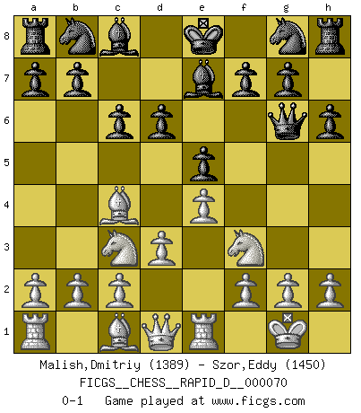 Last move : 0-1 2012 September 19 7:34:18 [Event "FICGS__CHESS__RAPID_D__000070"] [Site "FICGS"] [Date "2012.07.30"] [Round "1"] [White "Malish,Dmitriy"] [Black "Szor,Eddy"] [Result "0-1"] [WhiteElo "1389"] [BlackElo "1450"] 1.e4 e5 2.Nf3 d6 3.Bc4 h6 4.O-O Qf6 5.Nc3 c6 6.Re1 Be7 7.d3 Qg6 0-1 This chess game has been lost on time (started : 2012.07.30 10:34:17) Philidor's defense Kingside Castling by player White (move 4) Player Black won this chess game. Follow this game move after move (download)When you don't know what to play, wait for an idea to come into your opponent's mind. You may be sure that idea will be wrong. (Siegbert Tarrasch) Es gibt nur zwei wahre Schachgenies - das andere war Wilhelm Steinitz, der Weltmeister von 1872 bis 1894. (Robert James Fischer) Bobby Fischer es el jugador de Ajedrez mas grande que jamás haya existido. (Ken Smith) Il n'y a pas de prix trop élevé au scalp de l'ennemi. (Koblentz) The Internet is the first thing that humanity has build that humanity doesn't understand, the largest experiment in anarchy that we have ever had. (Eric Schmidt)