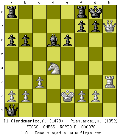 Last move : 1-0 2012 October 23 15:3:9 [Event "FICGS__CHESS__RAPID_D__000070"] [Site "FICGS"] [Date "2012.07.30"] [Round "1"] [White "Di Giandomenico,Alfonso"] [Black "Piantadosi,Angelo"] [Result "1-0"] [WhiteElo "1479"] [BlackElo "1352"] 1.e4 e6 2.d4 d5 3.Nd2 dxe4 4.Nxe4 Nd7 5.Nf3 Ngf6 6.Nxf6+ Nxf6 7.c3 Be7 8.Bd3 O-O 9.O-O b6 10.Bf4 Bb7 11.Re1 c5 12.Be5 cxd4 13.Nxd4 a6 14.Qc2 Bd6 15.Bxf6 Qxf6 16.Bxh7+ Kh8 17.Be4 Bxe4 18.Qxe4 Qh6 19.Re3 Qxh2+ 20.Kf1 Qh1+ 21.Ke2 Qxa1 22.Rh3+ Kg8 23.Qh7+ 1-0 French : Tarrasch Kingside Castling by player Black (move 8) Kingside Castling by player White (move 9) Player White won this chess game. Follow this game move after move (download)Winning isn't everything... but losing is nothing. (Mednis) Obendrein hat der FIDE-Präsident den Revolutionsführer Gaddafi zum »Großmeister« ernannt, am Ende der WM. Das ist lächerlich! (Joel Lautier) El Ajedrez por encima de todo... ¡es una pelea!. (Emanuel Lasker) Un footballeur joue avec ses pieds, parfois avec sa tête. Un joueur d'échecs ne joue qu'avec sa tête. Et quand il ne joue plus, il meurt. (Jacob Murray) Do you know these so called Volunteers don't even get paid! (Simpsons)