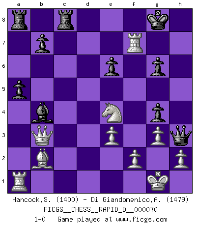 Last move : 1-0 2012 September 23 20:48:32 [Event "FICGS__CHESS__RAPID_D__000070"] [Site "FICGS"] [Date "2012.07.30"] [Round "1"] [White "Hancock,Sarah"] [Black "Di Giandomenico,Alfonso"] [Result "1-0"] [WhiteElo "1400"] [BlackElo "1479"] 1.d4 Nf6 2.Nf3 e6 3.Bf4 c5 4.e3 d5 5.c4 Bd7 6.dxc5 Bxc5 7.Nc3 Qa5 8.a3 dxc4 9.Bxc4 Qd8 10.O-O O-O 11.Qc2 Nc6 12.Rfd1 Qe7 13.b4 Nxb4 14.axb4 Bxb4 15.Be5 Bc6 16.Ng5 g6 17.Nce4 Ng4 18.Bb2 Bxe4 19.Nxe4 Rfc8 20.Qb3 a5 21.Be2 h5 22.Bxg4 hxg4 23.Rd7 Qh4 24.g3 Qh3 25.Rxf7 1-0 Queen's pawn game Kingside Castling by player White (move 10) Kingside Castling by player Black (move 10) Player White won this chess game. Follow this game move after move (download)A great player and a great example for many. His book My 60 Memorable Games had a big impact on me. It is a shame he didn't continue to enrich the world of chess with his unparalleled understanding after 1972. (Jan Timman, about Bobby Fischer's death) Nach Morphy wurde nichts neues mehr in der Behandlung offener Positionen gefunden. (Mikhail Moiseyevich Botvinik) El Ajedrez es un expediente tonto que hace creer a la gente inactiva que hacen una cosa muy astuta cuando solamente estan perdiendo su tiempo. (George Bernard Shaw) On entre au jeu d'Echecs comme on entre en Religion. Pour le joueur d'Echecs, la partie d'Echecs c'est l'office, la messe, le défilé du 1er Mai, le dépôt de gerbe au Monument aux Morts. C'est un drame sacré. (Michel Roos) Computer Science is no more about computers than astronomy is about telescopes. (Edsger W. Dijkstra)