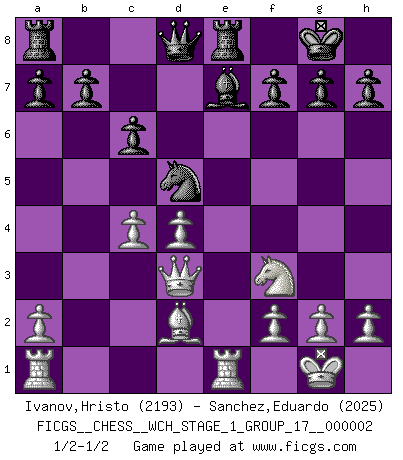 Last move : 1/2-1/2 2007 March 6 21:51:24 [Event "FICGS__CHESS__WCH_STAGE_1_GROUP_17__000002"] [Site "FICGS"] [Date "2007.01.16"] [Round "1"] [White "Ivanov,Hristo"] [Black "Sanchez,Eduardo"] [Result "1/2-1/2"] [WhiteElo "2193"] [BlackElo "2025"] 1.e4 e5 2.Nf3 Nf6 3.Nxe5 d6 4.Nf3 Nxe4 5.d4 d5 6.Bd3 Nc6 7.O-O Bf5 8.Re1 Be7 9.Nc3 Nxc3 10.bxc3 Bxd3 11.Qxd3 O-O 12.c4 Nb4 13.Qb3 dxc4 14.Qxc4 Re8 15.Bd2 Nd5 16.Qd3 c6 17.c4 1/2-1/2 Petrov : Classical attack Kingside Castling by player White (move 7) Kingside Castling by player Black (move 11) This chess game ended in a draw. Follow this game move after move (download)I'm not a materialistic person, in that, I don't suffer the lack or loss of money. The absence of worldly goods I don't look back on. For Chess is a way I can be as materialistic as I want without having to sell my soul. (Jamie Walter Adams) Schach ist mein Leben, meine Leidenschaft, was ich gelernt habe und seit meinem 14. Lebensjahr profimässig praktiziere. Darauf zu verzichten, würde mir sehr schwer fallen. (Viktor Kortschnoi) Cuando le juegas a Fischer, no es una cuestion de si vas a ganar o perder. Es una cuestion de si vas a sobrevivir. (Boris Spassky) Des points faibles ou des trous dans la position de l'adversaire doivent être occupés par des pièces et non pas par des pions. (Siegbert Tarrasch) The existence of forgetting has never been proved: We only know that some things don't come to mind when we want them. (Friedrich Nietzsche)
