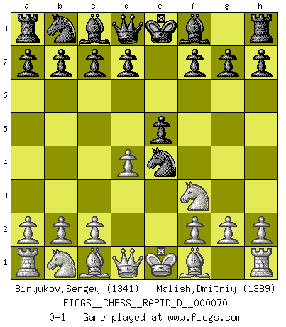 Last move : 0-1 2012 September 6 17:18:57 [Event "FICGS__CHESS__RAPID_D__000070"] [Site "FICGS"] [Date "2012.07.30"] [Round "1"] [White "Biryukov,Sergey"] [Black "Malish,Dmitriy"] [Result "0-1"] [WhiteElo "1341"] [BlackElo "1389"] 1.e4 e5 2.Nf3 Nf6 3.d4 Nxe4 0-1 This chess game has been lost on time (started : 2012.07.30 10:34:17) Petrov : Modern attack, Symmetrical variation Player Black won this chess game. Follow this game move after move (download)A man that will take back a move at Chess will pick a pocket. (Richard Fenton) Ich liebe den Moment, wenn ich das Ego meines Gegenüber breche. (Robert James Fischer) El juego de Fischer siempre fue nítido, racional y brillante. Uno de los mejores por siempre. (Dave Regis) Vous m'avez demandé de vous exposer quel est le fondement de la prière. Je ne fais que préparer les pièces du jeu sur la table... Nous sera-t-il permis d'en adopter les règles et si nous les appliquons scrupuleusement nous ne tarderons pas à faire mat le Roi divin ! Il ne pourra échapper à nos mains. (Sainte Thérèse d'Avila, Chemin de perfection) May I never be complete. May I never be content. May I never be perfect. Deliver me, Tyler, from being perfect and complete. (Chuck Palahniuk, Fight Club)