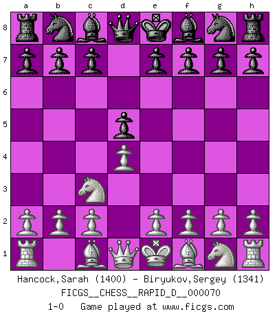 Last move : 1-0 2012 September 5 17:7:2 [Event "FICGS__CHESS__RAPID_D__000070"] [Site "FICGS"] [Date "2012.07.30"] [Round "1"] [White "Hancock,Sarah"] [Black "Biryukov,Sergey"] [Result "1-0"] [WhiteElo "1400"] [BlackElo "1341"] 1.d4 d5 2.Nc3 1-0 This chess game has been lost on time (started : 2012.07.30 10:34:17) Queen's pawn : Chigorin variation Player White won this chess game. Follow this game move after move (download)I'm not a materialistic person, in that, I don't suffer the lack or loss of money. The absence of worldly goods I don't look back on. For Chess is a way I can be as materialistic as I want without having to sell my soul. (Jamie Walter Adams) Schach ist mein Leben, meine Leidenschaft, was ich gelernt habe und seit meinem 14. Lebensjahr profimässig praktiziere. Darauf zu verzichten, würde mir sehr schwer fallen. (Viktor Kortschnoi) Algunos sacrificios son sólidos, los demás son míos. (Mikhail Tal) Aux échecs, les retours au sommet sont rares : les dommages psychologiques consécutifs à une défaite sont trop sévères. (Daily Telegraph) Memory... is the diary that we all carry with us. (Oscar Wilde, The Importance of Being Earnest)