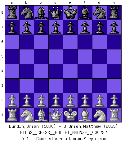 Last move : 0-1 2012 July 31 12:25:28 [Event "FICGS__CHESS__BULLET_BRONZE__000727"] [Site "FICGS"] [Date "2012.07.31"] [Round "1"] [White "Lundin,Brian"] [Black "O Brien,Matthew"] [Result "0-1"] [WhiteElo "1800"] [BlackElo "2055"] 0-1 This chess game has been lost on time (started : 2012.07.31 2:33:59) Player Black won this chess game. Follow this game move after move (download)You must take your opponent into a deep dark forest where 2+2=5, and the path leading out is only wide enough for one. (Mikhail Tal) Das Schach hält seine Meister in eigenen Banden, Fesseln; auf vielerlei Weise formt es ihren Geist, so dass die innere Freiheit selbst des Stärksten beeinflusst wird. (Albert Einstein) Solo puedes ser bueno en el Ajedrez si amas al juego. (Bobby Fischer) Il n'y a pas de prix trop élevé au scalp de l'ennemi. (Koblentz) I find your interest interesting. (Gregory House, House M.D.)