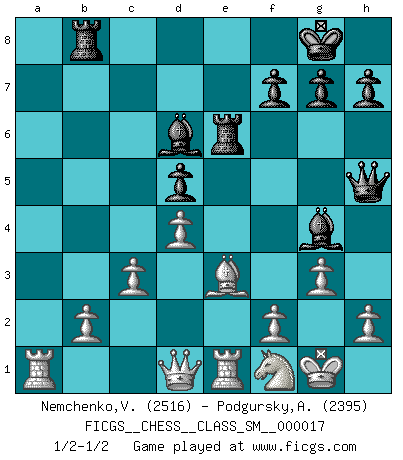 Last move : 1/2-1/2 2013 January 17 17:3:51 [Event "FICGS__CHESS__CLASS_SM__000017"] [Site "FICGS"] [Date "2012.07.31"] [Round "1"] [White "Nemchenko,Valery"] [Black "Podgursky,Artur"] [Result "1/2-1/2"] [WhiteElo "2516"] [BlackElo "2395"] 1.e4 e5 2.Nf3 Nc6 3.Bb5 a6 4.Ba4 Nf6 5.O-O Be7 6.Re1 b5 7.Bb3 O-O 8.c3 d5 9.exd5 Nxd5 10.Nxe5 Nxe5 11.Rxe5 c6 12.d4 Bd6 13.Re1 Qh4 14.g3 Qh3 15.Be3 Bg4 16.Qd3 Rae8 17.Nd2 Qh5 18.a4 Re6 19.axb5 axb5 20.Nf1 Bf5 21.Qd2 Rfe8 22.Bxd5 cxd5 23.Qe2 Bg4 24.Qxb5 Rb8 25.Qd3 Bf5 26.Qd1 Bg4 1/2-1/2 Ruy Lopez : Closed, 7...O-O Kingside Castling by player White (move 5) Kingside Castling by player Black (move 7) This chess game ended in a draw. Follow this game move after move (download)Bobby Fischer is the greatest Chess genius of all time ! (Alexander Kotov) Alle Schachspieler sollten auch ein Hobby haben. (Savielly Grigorievitsch Tartakower) Me siento como si fuera una pieza en una partida de Ajedrez, cuando mi oponente me indica: esa pieza no puede ser movida. (Soren Kierkegaard) Donnez-moi un Cavalier en 6e et je gagnerais toutes mes parties. (Steinitz) History is a gallery of pictures in which there are few originals and many copies. (Alexis de Tocqueville)
