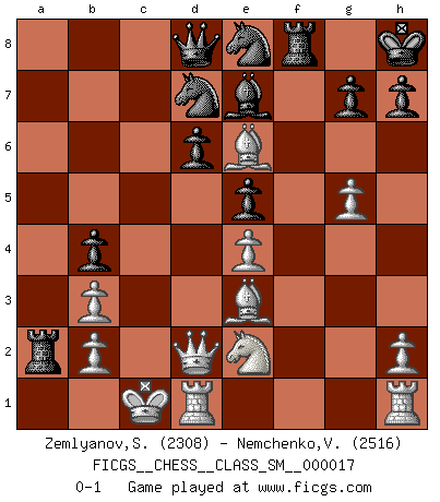 Last move : 0-1 2012 December 24 10:52:47 [Event "FICGS__CHESS__CLASS_SM__000017"] [Site "FICGS"] [Date "2012.07.31"] [Round "1"] [White "Zemlyanov,Sergey"] [Black "Nemchenko,Valery"] [Result "0-1"] [WhiteElo "2308"] [BlackElo "2516"] 1.e4 c5 2.Nf3 d6 3.d4 cxd4 4.Nxd4 Nf6 5.Nc3 a6 6.Be3 e5 7.Nb3 Be6 8.f3 Be7 9.Qd2 O-O 10.O-O-O Nbd7 11.g4 b5 12.g5 b4 13.Ne2 Ne8 14.f4 a5 15.f5 a4 16.fxe6 axb3 17.cxb3 fxe6 18.Bh3 Rxa2 19.Bxe6+ Kh8 0-1 This chess game has been lost on time (started : 2012.07.31 12:44:44) Sicilian : Najdorf, Byrne (English) attack Kingside Castling by player Black (move 9) Queenside Castling by player White (move 10) Player Black won this chess game. Follow this game move after move (download)Nowadays, when you're not a grandmaster at 14, you can forget about it. (Anand Viswanathan) Wenn Spassky eine Figur opfert kannst du genauso gut aufgeben. Aber wenn Tal eine Figur opfert, spiel weiter. Er könnte noch eine weitere opfern, und dann ... wer weiß? (Miguel Najdorf) El Ajedrez hace al hombre ser mas sabio y ver mas claro. (Vladimir Putin) Même un GMI sait rarement calculer sur plus de cinq coups une attaque à sacrifices. (Rudolf Spielmann) Crush them ! Make them suffer ! (General Grievous in Star Wars ep.3)