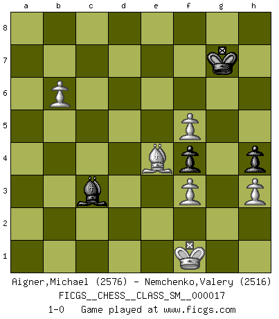 Last move : 1-0 2013 July 10 5:17:16 [Event "FICGS__CHESS__CLASS_SM__000017"] [Site "FICGS"] [Date "2012.07.31"] [Round "1"] [White "Aigner,Michael"] [Black "Nemchenko,Valery"] [Result "1-0"] [WhiteElo "2576"] [BlackElo "2516"] 1.d4 Nf6 2.c4 g6 3.Nc3 Bg7 4.e4 d6 5.Nf3 O-O 6.Be2 e5 7.O-O Nc6 8.d5 Ne7 9.Ne1 Nd7 10.Be3 f5 11.f3 f4 12.Bf2 g5 13.Nd3 Nf6 14.c5 Ng6 15.a4 h5 16.Nb5 g4 17.Qc2 Ne8 18.Kh1 a6 19.Na3 Qg5 20.cxd6 g3 21.dxc7 h4 22.h3 gxf2 23.Nc4 Rf6 24.Rxf2 Bf8 25.Qb3 b5 26.axb5 Nxc7 27.b6 Nb5 28.Bf1 Rb8 29.Rc1 Rf7 30.Rd2 Qf6 31.Qa2 Nd6 32.b3 Rg7 33.Rdc2 Bd7 34.Qxa6 Nc8 35.d6 Nxd6 36.Qa7 Qd8 37.Nxd6 Bxd6 38.b7 Kh7 39.Qa6 Qe7 40.Rc8 Bxh3 41.Rxb8 Bxb8 42.gxh3 Qxb7 43.Qe6 Ba7 44.Nxe5 Nxe5 45.Qxe5 Qb6 46.Qf5+ Qg6 47.Bc4 Qxf5 48.exf5 Bd4 49.Rd1 Bf6 50.b4 Rc7 51.Bd5 Rc2 52.Rg1 Rb2 53.Rg6 Rb1+ 54.Kg2 Bd4 55.Be4 Ra1 56.Rg4 Ra2+ 57.Kf1 Kh8 58.b5 Rd2 59.Rg6 Bc3 60.b6 Rd1+ 61.Kg2 Rd2+ 62.Kh1 Rd1+ 63.Kh2 Rd2+ 64.Rg2 Rxg2+ 65.Kxg2 Kg7 66.Kf1 1-0 Thibault de Vassal That's a very interesting game! King's Indian : Orthodox, Aronin-Taimanov variation (Yugoslav attack / Mar del Plata variation) Kingside Castling by player Black (move 5) Kingside Castling by player White (move 7) 10 pieces endgame at move 65 : White KBPPPP , Black KBPP WHITE : King + 1 Bishop 4 Pawns BLACK : King + 1 Bishop 2 Pawns Player White won this chess game. Follow this game move after move (download)After black's reply to 1.e4 with 1..e5, leaves him always trying to get into the game. (Howard Staunton) Das typische an einem Großmeister ist, daß er eine gewonnene Position schnell und schmerzlos gewinnt. (Irving Chernev) No es una movida, aún la mejor movida que tu debas buscar, sino un plan comprensible. (Eugene Znosko-Borovsky) Nous sommes les pions de la mystérieuse partie d'Echecs jouée par Dieu. Il nous déplace, nous arrête, nous pousse encore, puis nous lance un à un dans la boîte du Néant. Epitaphe sur la tombe de David Janowsky (1868-1927). But they are useless. They can only give you answers. (Pablo Picasso, about computers)