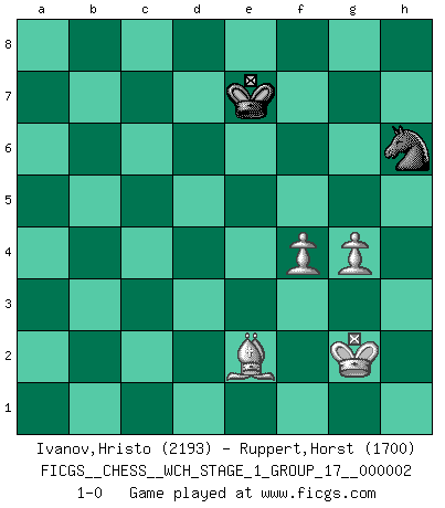 Last move : 1-0 2007 March 8 2:2:45 [Event "FICGS__CHESS__WCH_STAGE_1_GROUP_17__000002"] [Site "FICGS"] [Date "2007.01.16"] [Round "1"] [White "Ivanov,Hristo"] [Black "Ruppert,Horst"] [Result "1-0"] [WhiteElo "2193"] [BlackElo "1700"] 1.e4 d6 2.d4 Nf6 3.Nc3 g6 4.Be3 c6 5.Qd2 b5 6.Bd3 Nbd7 7.Nf3 e5 8.dxe5 dxe5 9.h3 Bb7 10.a4 a6 11.O-O Bg7 12.Ne2 O-O 13.Ng3 Qe7 14.c4 Rfd8 15.axb5 cxb5 16.cxb5 axb5 17.Rxa8 Bxa8 18.Qa5 b4 19.Bc4 h6 20.Nh4 Nf8 21.Bc5 Qd7 22.Re1 Rb8 23.Nf3 Ne8 24.Bxb4 Nd6 25.Bxd6 Qxd6 26.Qa7 Nd7 27.h4 Bc6 28.Qa2 Rf8 29.h5 Nb6 30.hxg6 Qxg6 31.Bb3 Ra8 32.Nf5 Rxa2 33.Ne7+ Kh7 34.Nxg6 Rxb2 35.Bxf7 Rb5 36.Ne7 Bd7 37.Bg6+ Kh8 38.Nf5 Kg8 39.Rc1 Na4 40.Rc7 Bxf5 41.Bxf5 Rb6 42.Nh4 Bf6 43.Bh7+ Kf8 44.Nf5 Bg5 45.g3 Ke8 46.Bg8 Kd8 47.Rc4 Rb1+ 48.Kg2 Nb6 49.Rc6 Nd7 50.Nxh6 Bxh6 51.Rxh6 Nc5 52.Rh5 Re1 53.Rxe5 Nd7 54.Rd5 Rxe4 55.Bh7 Re5 56.Rxe5 Nxe5 57.f4 Ng4 58.Bd3 Ke7 59.Be2 Nh6 60.g4 1-0 Pirc : 150 attack Kingside Castling by player White (move 11) Kingside Castling by player Black (move 12) 10 pieces endgame at move 51 : White KRBPPP , Black KRNP WHITE : King + 1 Rook 1 Bishop 3 Pawns BLACK : King + 1 Rook 1 Knight 1 Pawn 9 pieces endgame at move 53 : White KRBPPP , Black KRN WHITE : King + 1 Rook 1 Bishop 3 Pawns BLACK : King + 1 Rook 1 Knight 8 pieces endgame at move 54 : White KRBPP , Black KRN WHITE : King + 1 Rook 1 Bishop 2 Pawns BLACK : King + 1 Rook 1 Knight 7 pieces endgame at move 56 : White KRBPP , Black KN WHITE : King + 1 Rook 1 Bishop 2 Pawns BLACK : King + 1 Knight 6 pieces endgame at move 56 : White KBPP , Black KN WHITE : King + 1 Bishop 2 Pawns BLACK : King + 1 Knight Player White won this chess game. Follow this game move after move (download)Place the contents of the Chess box in a hat, shake them up vigorously, pour them on the board from a height of two feet, and you get the style of Steinitz. (H. E. Bird) Wenn du nicht weißt was du tun sollst, warte bis dein Gegner eine Idee hat. Sie wird sicher schlecht sein. (Siegbert Tarrasch) La esencia del Ajedrez es pensar acerca de lo que el Ajedrez es. (David Bronstein) Les échecs, c'est la lutte contre l'erreur. (Johannes Zukertort) If you ain't just a little scared when you enter a casino, you are either very rich or you haven't studied the games enough. (Pappy)