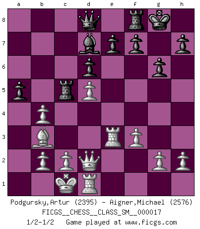 Last move : 1/2-1/2 2012 October 15 20:17:36 [Event "FICGS__CHESS__CLASS_SM__000017"] [Site "FICGS"] [Date "2012.07.31"] [Round "1"] [White "Podgursky,Artur"] [Black "Aigner,Michael"] [Result "1/2-1/2"] [WhiteElo "2395"] [BlackElo "2576"] 1.e4 c5 2.Nf3 d6 3.d4 cxd4 4.Nxd4 Nf6 5.Nc3 g6 6.Be3 Bg7 7.f3 Nc6 8.Qd2 O-O 9.Bc4 Bd7 10.O-O-O Rc8 11.Bb3 Nxd4 12.Bxd4 b5 13.Nd5 Nxd5 14.Bxg7 Kxg7 15.exd5 a5 16.a3 Kg8 17.Rhe1 Rc5 18.Re3 b4 19.axb4 1/2-1/2 Sicilian : Dragon, Yugoslav attack Kingside Castling by player Black (move 8) Queenside Castling by player White (move 10) This chess game ended in a draw. Follow this game move after move (download)I am still a victim of Chess. It has all the beauty of art and much more. It cannot be commercialized. Chess is much purer than art in its social position. (Marcel Duchamp) Offensichtlich kennt Kasparow nichts anderes als Schach, und ich könnte 500 weitere Spieler dieser Sorte benennen. (Judith Polgar) Fischer deseaba darle a los Rusos una sopa de su propia medicina. (Larry Evans) Si je n'étais pas joueur d'échecs, je serais le meilleur dans quelque chose d'autre. (Anatoli Karpov) May the force be with you. (Han Solo in Star Wars ep.4)