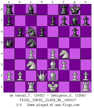 Last move : 1-0 2013 January 4 23:33:31 [Event "FICGS__CHESS__CLASS_SM__000017"] [Site "FICGS"] [Date "2012.07.31"] [Round "1"] [White "de Vassal,Thibault"] [Black "Zemlyanov,Sergey"] [Result "1-0"] [WhiteElo "2432"] [BlackElo "2308"] 1.d4 Nf6 2.c4 g6 3.Nc3 Bg7 4.e4 d6 5.f3 O-O 6.Be3 c5 7.Nge2 Qa5 8.Nc1 cxd4 9.Nb3 Qh5 10.Nxd4 Nc6 11.Nde2 Nd7 12.Nf4 Qa5 13.Rc1 Nc5 14.Qd2 b6 15.Be2 1-0 King's Indian : Saemisch, 5...O-O Kingside Castling by player Black (move 5) Player White won this chess game. Follow this game move after move (download)Good offense and good defense both begin with good development. (Bruce A. Moon) Schach ist ein Kampf gegen den Fehler. (Johannes Herrman Zukertort) Botvinnik trató de alejar el misterio referente al Ajedrez, siempre relacionandolo a situaciones de la vida diaria. Solía llamar al Ajedrez un problema inexacto típico, similar a aquellos en que la gente tiene siempre que resolver a cada día. (Garry Kasparov) On est toujours la mazette de quelqu'un d'autre. (Anonyme) Convictions are more dangerous enemies of truth than lies. (Friedrich Nietzsche)