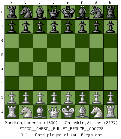 Last move : 0-1 2012 August 3 0:33:35 [Event "FICGS__CHESS__BULLET_BRONZE__000728"] [Site "FICGS"] [Date "2012.08.02"] [Round "1"] [White "Mandias,Lorenzo"] [Black "Shishkin,Viktor"] [Result "0-1"] [WhiteElo "1600"] [BlackElo "2177"] 0-1 This chess game has been lost on time (started : 2012.08.02 15:57:2) Player Black won this chess game. Follow this game move after move (download)He who takes the Queen's Knight's Pawn will sleep in the streets. (Anonymous) Schach ist ein Kampf gegen den Fehler. (Johannes Herrman Zukertort) Un juego de Ajedrez es un dialogo, una conversación entre un jugador y su oponente. Cada movimiento del oponente puede contener amenazas o tropiezos, pero un jugador no se puede defender de las amenazas o tomar ventaja de los tropiezos si es que no se pregunta a sí mismo: ¿Que es lo que mi oponente va a hacer después de cada movida?. (Bruce A. Moon) Je ne crois pas en la psychologie, je crois aux bons coups. (Robert Fischer) A belief is an idea the mind possesses, an idea that possesses the mind. (Robert Oxden Bolton)