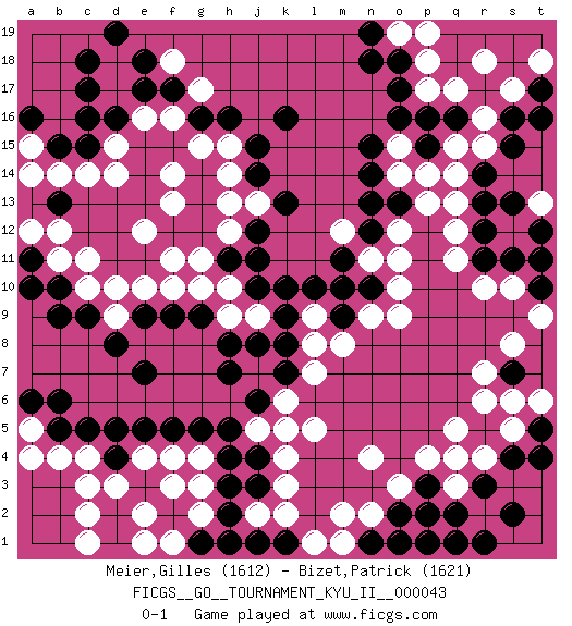 Last move : 0-1 2013 April 26 21:13:55 [Event "FICGS__GO__TOURNAMENT_KYU_II__000043"] [Site "FICGS"] [Date "2012.08.03"] [Round "1"] [Black "Meier,Gilles"] [White "Bizet,Patrick"] [Result "0-1"] [Rating 1 "1612"] [Rating 2 "1621"] 1.q16 d3 2.d16 q4 3.c5 c4 4.d5 f4 5.e7 r10 6.k16 o3 7.r13 c14 8.c15 d14 9.f17 c11 10.c9 f14 11.r3 r4 12.s4 s5 13.s2 q3 14.q2 p2 15.r1 o10 16.h7 k6 17.h5 k4 18.h3 g3 19.j4 k3 20.h2 g2 21.n15 q17 22.r17 r16 23.s16 r15 24.s15 q15 25.p16 q13 26.r14 q14 27.r12 q12 28.k10 f11 29.b15 b14 30.b10 b11 31.g13 f13 32.g12 e10 33.f12 e12 34.g14 p17 35.o16 s17 36.o17 p18 37.o18 r18 38.s11 s10 39.r11 q11 40.t16 t13 41.s13 t11 42.t12 s12 43.b13 a14 44.t12 l9 45.l10 m10 46.k9 l8 47.k8 m12 48.m11 n11 49.m9 m8 50.n10 n9 51.m10 o9 52.t10 t9 53.t11 s8 54.n12 o11 55.n13 e16 56.e17 f16 57.g16 d15 58.c16 b4 59.b5 g11 60.h11 h10 61.j11 o19 62.n19 p19 63.n18 a5 64.a6 a4 65.b6 d9 66.d8 c10 67.b9 j2 68.k5 l5 69.k7 l7 70.j6 j5 71.j3 k2 72.e3 e4 73.d4 c3 74.f5 g4 75.g5 k5 76.h4 o12 77.t5 t6 78.t4 r6 79.f2 f1 80.d2 e1 81.d1 c2 82.h1 c1 83.g1 e2 84.e5 f3 85.e9 d10 86.f9 f10 87.g9 g10 88.o13 h9 89.h8 a15 90.a16 p13 91.a11 a12 92.a10 b12 93.p1 o1 94.q1 d17 95.c17 d18 96.c18 g17 97.e18 g15 98.h16 h15 99.j15 h14 100.j14 h12 101.j12 h13 102.j1 j13 103.k13 o14 104.n14 o15 105.p15 p14 106.t17 t18 107.k1 l1 108.n1 n2 109.o2 f18 110.d19 o1 111.r5 q5 112.o2 m2 113.p3 p4 114.p2 j9 115.j8 m1 116.j10 o1 117.s7 s6 118.n1 n4 119.o1 r7 0-1 Here are the names of the openings (joseki) played in the four corners : Corner d4 : d3 c5 Komoku (Somok, Xiao~mu`) 3-4 Point. The komoku (3-4) point is the traditional corner enclosure move.. Ikken Kakari (Hankan Keolch'im, Yi Gua`jiao~, 1-Space Low Pincer). The small knight move is the basic approach move to the 3-4 point stone. It has been continually used for over four centuries. There are limitless variations, with new moves constantly being discovered. Black 2 opens the door to a treaure store of joseki. Corner d16 : d16 c14 Hoshi (Hwajeom, Seongjeom, Xingwei`) 4-4 Point. The star or hoshi (4-4) point, emphasizing influence at the potential expense of territory. Ikken Kakari (Hankan Keolch'im, Yi Gua`jiao~, 1-Space Low Approach). White 2 is the standard approach move to the 4-4. Player White won this Go (weiqi, baduk) game. Follow this game move after move (download)Nothing requires doing this or that, but necessity exists. (Pierre Audouard) They say in chess you've got to kill the queen, and then you mate it... Oh I, do you ? (Red Hot Chili Peppers, Fortune faded)