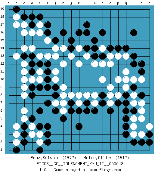Last move : 1-0 2012 August 21 22:41:23 [Event "FICGS__GO__TOURNAMENT_KYU_II__000043"] [Site "FICGS"] [Date "2012.08.03"] [Round "1"] [Black "Praz,Sylvain"] [White "Meier,Gilles"] [Result "1-0"] [Rating 1 "1977"] [Rating 2 "1612"] 1.r16 d4 2.q3 d16 3.f17 c14 4.l17 r5 5.q8 s7 6.q6 s3 7.f3 e3 8.f4 c6 9.k4 s10 10.d18 c17 11.h16 q11 12.r13 n14 13.n16 o12 14.q5 r4 15.q4 c10 16.f7 n10 17.s8 r7 18.q7 r8 19.d5 c5 20.c3 e2 21.c4 d3 22.c2 b4 23.e4 b3 24.f2 b2 25.e1 m8 26.m6 j8 27.j6 k14 28.j14 j13 29.h13 h14 30.j15 h12 31.k13 g13 32.l14 k15 33.k16 l15 34.m15 l13 35.l16 k12 36.m13 k14 37.m14 m12 38.n13 n12 39.p14 q9 40.f9 g10 41.g9 h9 42.f10 g11 43.d9 c9 44.d8 c8 45.p9 p10 46.r9 q10 47.s2 r3 48.r2 p8 49.p7 o8 50.l7 l8 51.n7 o7 52.o6 k7 53.k6 m7 54.l6 h7 55.g6 f15 56.d11 c11 57.d12 c12 58.n8 o9 59.c18 b18 60.d17 c16 61.s12 h6 62.h5 g7 63.e6 q13 64.q14 p13 65.s11 r10 66.d13 d14 67.f16 e16 68.b19 b17 69.g15 g14 70.t3 t4 71.r6 s6 72.t2 s5 73.b1 d10 74.f11 e17 75.e18 e13 76.f12 f13 77.c13 b13 78.j7 k8 79.g8 h8 80.r12 o13 81.o14 e11 82.e12 e10 83.e9 1-0 Here are the names of the openings (joseki) played in the four corners : Corner d16 : d16 f17 Hoshi (Hwajeom, Seongjeom, Xingwei`) 4-4 Point. The star or hoshi (4-4) point, emphasizing influence at the potential expense of territory. Ikken Kakari (Hankan Keolch'im, Yi Gua`jiao~, 1-Space Low Approach). Black 2 is the standard approach move to the 4-4. Corner q4 : q3 r5 Komoku (Somok, Xiao~mu`) 3-4 Point. The komoku (3-4) point is the traditional corner enclosure move.. Ikken Kakari (Hankan Keolch'im, Yi Gua`jiao~, 1-Space Low Pincer). The small knight move is the basic approach move to the 3-4 point stone. It has been continually used for over four centuries. There are limitless variations, with new moves constantly being discovered. White 2 opens the door to a treaure store of joseki. Corner d4 : d4 f3 Hoshi (Hwajeom, Seongjeom, Xingwei`) 4-4 Point. The star or hoshi (4-4) point, emphasizing influence at the potential expense of territory. Ikken Kakari (Hankan Keolch'im, Yi Gua`jiao~, 1-Space Low Approach). Black 2 is the standard approach move to the 4-4. Player Black won this Go (weiqi, baduk) game. Follow this game move after move (download)The game plays itself, the players don't control it. (Pierre Audouard) In theory there is no difference between theory and practice. In practice there is. (Yogi Berra)