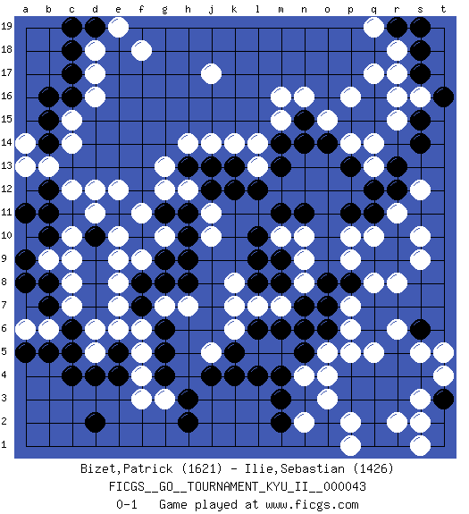 Last move : 0-1 2013 May 31 21:37:8 [Event "FICGS__GO__TOURNAMENT_KYU_II__000043"] [Site "FICGS"] [Date "2012.08.03"] [Round "1"] [Black "Bizet,Patrick"] [White "Ilie,Sebastian"] [Result "0-1"] [Rating 1 "1621"] [Rating 2 "1426"] 1.q4 r16 2.d4 d16 3.k4 r6 4.r10 o3 5.p3 o4 6.r4 p6 7.r13 p16 8.d10 d12 9.c6 f4 10.g6 f6 11.g5 f5 12.g4 g3 13.h3 f3 14.f7 g7 15.h2 e7 16.f8 d6 17.c5 c7 18.d2 e9 19.h8 f9 20.g9 e8 21.g8 j17 22.c17 d17 23.c16 c15 24.b15 c14 25.b14 b13 26.c18 d18 27.g11 p10 28.s15 g13 29.h13 h14 30.j13 j14 31.s17 s16 32.t16 r15 33.s14 r17 34.s18 r18 35.k13 k14 36.m13 l13 37.l12 l14 38.m11 h12 39.k12 g12 40.p8 q8 41.q9 p9 42.o8 r8 43.o6 p5 44.m14 m15 45.f10 e10 46.e11 d11 47.n5 r11 48.q11 q10 49.r9 s10 50.r12 s9 51.p11 n10 52.m9 n9 53.m8 n8 54.n7 p7 55.o14 o15 56.n15 n16 57.n14 m16 58.b7 c8 59.b8 b9 60.b10 c10 61.a9 c9 62.b11 a14 63.b16 e12 64.h11 f11 65.p4 o5 66.m3 p2 67.q2 n2 68.m2 s5 69.s4 s2 70.r3 r2 71.r1 s1 72.q1 p1 73.q3 t4 74.t3 t5 75.d19 e19 76.c19 f18 77.o7 n4 78.m4 m5 79.n6 m10 80.l10 m7 81.m6 l7 82.l8 k8 83.l9 j11 84.j12 g10 85.h10 j10 86.h9 p14 87.p13 q14 88.r19 q19 89.s19 q17 90.n11 q13 91.q12 s12 92.r5 s3 93.e5 d5 94.e4 e6 95.s6 q5 96.b12 c12 97.c4 a10 98.a11 b6 99.b5 a6 100.a8 a13 101.a5 l5 102.l6 k7 103.k5 k6 104.l4 j5 105.j4 h7 0-1 Here are the names of the openings (joseki) played in the four corners : Corner q4 : q4 r6 Hoshi (Hwajeom, Seongjeom, Xingwei`) 4-4 Point. The star or hoshi (4-4) point, emphasizing influence at the potential expense of territory. Ikken Kakari (Hankan Keolch'im, Yi Gua`jiao~, 1-Space Low Approach). White 2 is the standard approach move to the 4-4. Corner q16 : r16 r13 Komoku (Somok, Xiao~mu`) 3-4 Point. The komoku (3-4) point is the traditional corner enclosure move.. Player White won this Go (weiqi, baduk) game. Follow this game move after move (download)Those who are good at winning, don't usually fight. (Zhang) The problem with manipulation is that people can turn on you. (Horatio Caine, C.S.I. Miami)