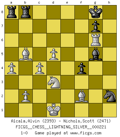 Last move : 1-0 2012 August 3 19:14:2 [Event "FICGS__CHESS__LIGHTNING_SILVER__000221"] [Site "FICGS"] [Date "2012.08.03"] [Round "1"] [White "Alcala,Alvin"] [Black "Nichols,Scott"] [Result "1-0"] [WhiteElo "2393"] [BlackElo "2471"] 1.e4 c5 2.Nf3 d6 3.d4 cxd4 4.Nxd4 Nf6 5.Nc3 a6 6.Be3 e5 7.Nb3 Be6 8.f3 Nbd7 9.Qd2 Be7 10.g4 h6 11.h4 b5 12.a4 b4 13.Nd5 Bxd5 14.exd5 e4 15.Bd4 exf3 16.O-O-O O-O 17.g5 hxg5 18.hxg5 Ng4 19.Qd3 Bxg5+ 20.Kb1 Bh6 21.Qxf3 Nde5 22.Qh3 Qd7 23.Na5 f5 24.Qb3 Rfe8 25.Nc6 Qf7 26.Nxb4 Nd7 27.Nxa6 Ndf6 28.Qa3 Rec8 29.Nb4 Ne4 30.Bb5 Rcb8 31.c4 f4 32.Qf3 Qf5 33.Nd3 Ng3 34.Rhe1 Qg5 35.Rg1 Qg6 36.Bc6 Nh2 37.Qg2 Qh5 38.Bf2 Ne2 39.Qg6 Qxg6 40.Rxg6 Nc3+ 41.Kc2 Nxd1 42.Kxd1 Ra6 43.Bb5 R6a8 44.Rxd6 Bg5 45.Rg6 1-0 Sicilian : Najdorf, Byrne (English) attack Queenside Castling by player White (move 16) Kingside Castling by player Black (move 16) Player White won this chess game. Follow this game move after move (download)A player surprised is half beaten. (Proverb) Obwohl ich vom Stil her kaum zu den Priestern der Schachkunst gezählt werde, halte ich Schach doch für eine Kunst. (Tigran Petrosjan) Botvinnik trataba de restarle el misterio al Ajedrez, siempre relacionandolo a situaciones de la vida ordinaria. El gustaba de llamar al Ajedrez un típico problema inexacto similar a aquellos de los cuales la gente siempre tiene que enfrentarse en la vida cotidiana. (Garry Kasparov) La menace est plus forte que l'exécution. (Aaron Nimzovitch) Creativity is inventing, experimenting, growing, taking risks, breaking rules, making mistakes, and having fun. (Mary Lou Cook)