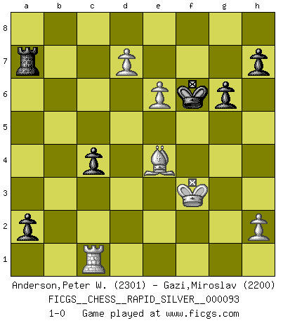 Last move : 1-0 2012 December 8 11:9:33 [Event "FICGS__CHESS__RAPID_SILVER__000093"] [Site "FICGS"] [Date "2012.08.04"] [Round "1"] [White "Anderson,Peter W."] [Black "Gazi,Miroslav"] [Result "1-0"] [WhiteElo "2301"] [BlackElo "2200"] 1.d4 Nf6 2.c4 e6 3.Nc3 Bb4 4.e3 O-O 5.Bd3 d5 6.Nf3 c5 7.O-O Nc6 8.a3 Bxc3 9.bxc3 Qc7 10.cxd5 exd5 11.Nh4 Qa5 12.Bb2 Re8 13.Nf5 c4 14.Bc2 Bxf5 15.Bxf5 Ne4 16.Qe1 Qa4 17.f3 Nd6 18.Bb1 f5 19.g4 Rf8 20.gxf5 Rae8 21.e4 Nxf5 22.Kh1 Na5 23.Qf2 Ne7 24.Bc2 Qb5 25.Rab1 Nb3 26.e5 Qd7 27.f4 g6 28.Rg1 Kh8 29.a4 Qxa4 30.Rg5 Qd7 31.Ba3 Qh3 32.Rg3 Qh6 33.Bxe7 Rxe7 34.f5 Qd2 35.Qxd2 Nxd2 36.f6 Nxb1 37.fxe7 Re8 38.Bxb1 Rxe7 39.Rg1 b5 40.Bc2 a5 41.Rb1 Rb7 42.Ba4 b4 43.Bc6 Rc7 44.Bxd5 bxc3 45.Kg2 a4 46.Ra1 Ra7 47.Kf3 c2 48.Be4 c1Q 49.Rxc1 a3 50.d5 a2 51.d6 Kg7 52.e6 Kf6 53.d7 1-0 Nimzo-Indian : 4.e3 O-O, 5.Bd3 d5 Kingside Castling by player Black (move 4) Kingside Castling by player White (move 7) Promotion Queen by player Black (move 48) Player White won this chess game. Follow this game move after move (download)A win by an unsound combination, however showy, fills me with artistic horror. (Wilhelm Steinitz) Wenn Dein Gegner dir ein Remis anbietet, versuch herauszufinden, weshalb er glaubt schlechter zu stehen. (Nigel Short) Un mal día en el Ajedrez, es mejor que cualquier buen día en el trabajo. (Anonymous) On a dit que l'homme se distingue de l'animal par le fait qu'il achète plus de livres qu'il ne peut en lire. Je voudrais suggérer qu'inclure à la liste des livres quelques livres d'échecs rendrait la distinction manifeste. (Edward Lasker) It's not the size of the dog in the fight, it's the size of the fight in the dog. (Mark Twain)