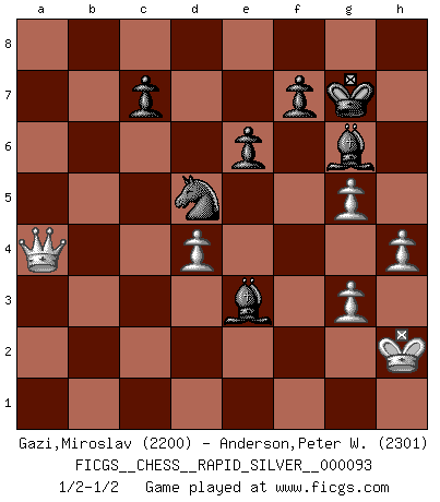 Last move : 1/2-1/2 2012 December 21 15:14:27 [Event "FICGS__CHESS__RAPID_SILVER__000093"] [Site "FICGS"] [Date "2012.08.04"] [Round "2"] [White "Gazi,Miroslav"] [Black "Anderson,Peter W."] [Result "1/2-1/2"] [WhiteElo "2200"] [BlackElo "2301"] 1.d4 d5 2.c4 e6 3.Nf3 Nf6 4.Bg5 dxc4 5.Nc3 a6 6.e3 b5 7.a4 b4 8.Ne4 Bb7 9.Nxf6+ gxf6 10.Bh4 Qd5 11.Rc1 c3 12.Bd3 Nd7 13.O-O Qa5 14.Bg3 Rb8 15.e4 Bd6 16.bxc3 bxc3 17.Qe1 Bb4 18.Rb1 Ba8 19.Qe3 h5 20.Qe2 Ke7 21.Bc2 Ba3 22.Qe3 Rxb1 23.Rxb1 Kd8 24.Rb3 Bb4 25.Qd3 Rg8 26.h3 Ke7 27.Rb1 Kd8 28.Qe3 Bf8 29.Rb3 Bb4 30.Qh6 Bc6 31.Rb1 Rxg3 32.fxg3 Bxa4 33.Ra1 Bxc2 34.Rxa5 Bxa5 35.Qxh5 Bb6 36.Qh6 Bxe4 37.Qc1 Ba5 38.Ne1 Bb4 39.g4 Nb6 40.Qf4 c2 41.Nxc2 Bxc2 42.Qxf6+ Ke8 43.Qe5 Nd5 44.Qe2 Bh7 45.Qxa6 Kf8 46.Qe2 Bd6 47.Kf2 Bf4 48.Kf3 Be3 49.Qb2 Bg5 50.g3 Be3 51.h4 Kg7 52.g5 Bg6 53.Qa1 Bf5 54.Kg2 Be4+ 55.Kh2 Bg6 56.Qa4 Bf5 57.Qc4 Bg6 58.Qa4 1/2-1/2 QGD Kingside Castling by player White (move 13) This chess game ended in a draw. Follow this game move after move (download)First-class players lose to second-class players because second-class players sometimes play a first-class game. (Siegbert Tarrasch) Der Traum, für den ich lebe, ist der von einem freien Russland. Viele mögen sagen: Russland hat doch ein Parlament, einen gewählten Präsidenten. Aber ich spüre, dass in meiner Heimat die Angst wiederkehrt. Eine Angst, sich frei zu äußern, bestimmte Dinge zu tun (Garry Kasparov) Yo jugué Ajedrez con el y a veces le pude haber ganado solo que siempre devuelve su última jugada y juega la partida de manera diferente. (Mark Twain) Plusieurs personnes se sont demandées comment Tal faisait pour gagner... En fait, c'est très simple ! Il met ses pièces au centre de l'échiquier et les sacrifie quelque part ! (David Bronstein) Memory is a complicated thing, a relative to truth, but not its twin. (Barbara Kingsolver, Animal Dreams)